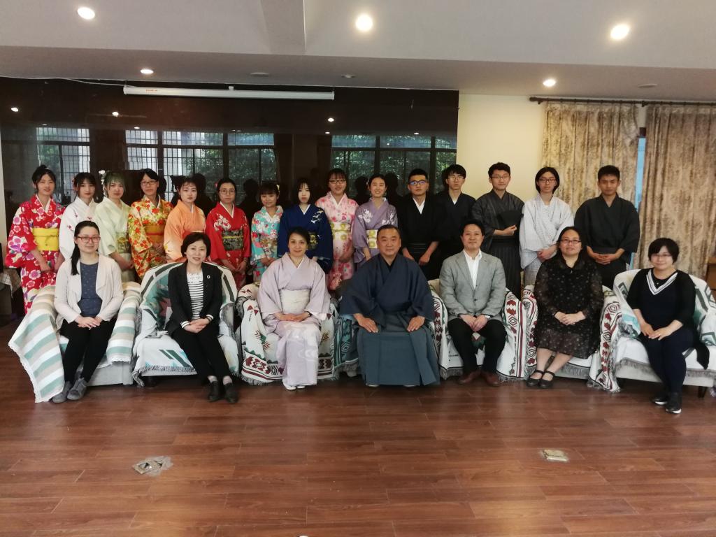 2018年4月26日,日语专业客座教员、原嘉兴日系企业协会会长、嘉兴杰富意精密钢管有限公司总经理青柳昌司先生携助手前来私房tv ,为日语专业学生举办了一场身着优雅和服,感受“一期一会”茶道思想的日本文化体验课。