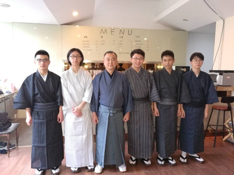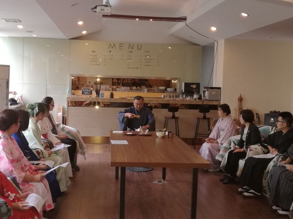 接下来,穿着和服的同学们围坐在青柳先生周围,倾听青柳先生对茶道的讲解。日本的茶道源自中国,在漫长的历史演变中,形成了独自的特色。茶道器具,朴素简约,简朴中凝结了崇高的智慧。青柳先生首先示范,一招一式,不慌不忙,稳重淡定。他说,何以如此?因为茶道旨在“一期一会”,不论地位高低,唯平等饮之,回归人心平静,不被世间纷乱搅扰。“一期一会”乃日本仿中国成语自创词汇,始创于日本茶道始祖千利休,是日本茶道思想之精髓。意指人的一生,彼此相见,只此一遭,清茶一杯,珍惜缘分,善待彼方。惟其如此,饮茶虽为日常行为,但却极富宗教、哲学、伦理和美学思想,故为“茶道”。