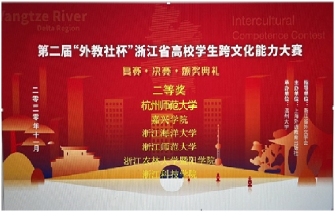 11月28日,第二届“外教社杯”浙江省高校学生跨文化能力大赛采用线下+线上方式进行。来自省内18所高校的代表队参加了本届大赛。经过校内选拨赛、省复赛、省决赛的层层选拨和激烈角逐,由王艳芳、李黄梅、金荣庆三位同学组成的嘉兴学院代表队荣获全省第六名、二等奖的好成绩。