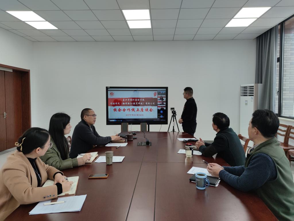 1月4日,私房tv 与译国译民(翻译服务/教育科技)有限公司举行校企合作线上见面会,双方就开展校企合作进行洽谈。会议由副院长喻锋平主持,学院领导班子成员参加见面会。