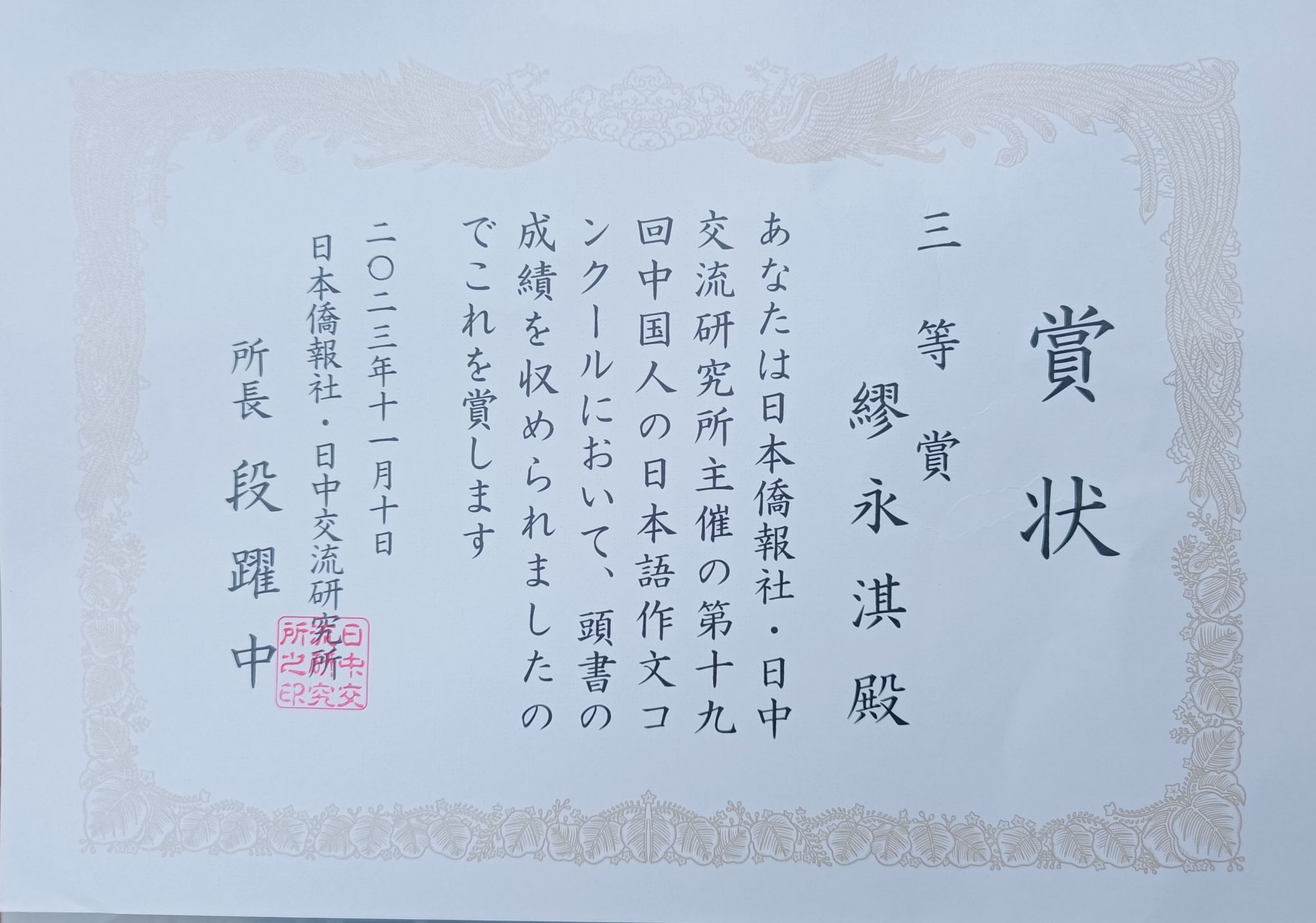 近日,由日本侨报社和日中交流研究所共同举办的“第19届全中国日语作文大赛”评选结果最终揭晓,私房tv 日语专业2020级缪永琪同学的日语作文“過去に鑑みて中日平和を孕む”(中文题目“以史为鉴 共育中日和平”)荣获三等奖。