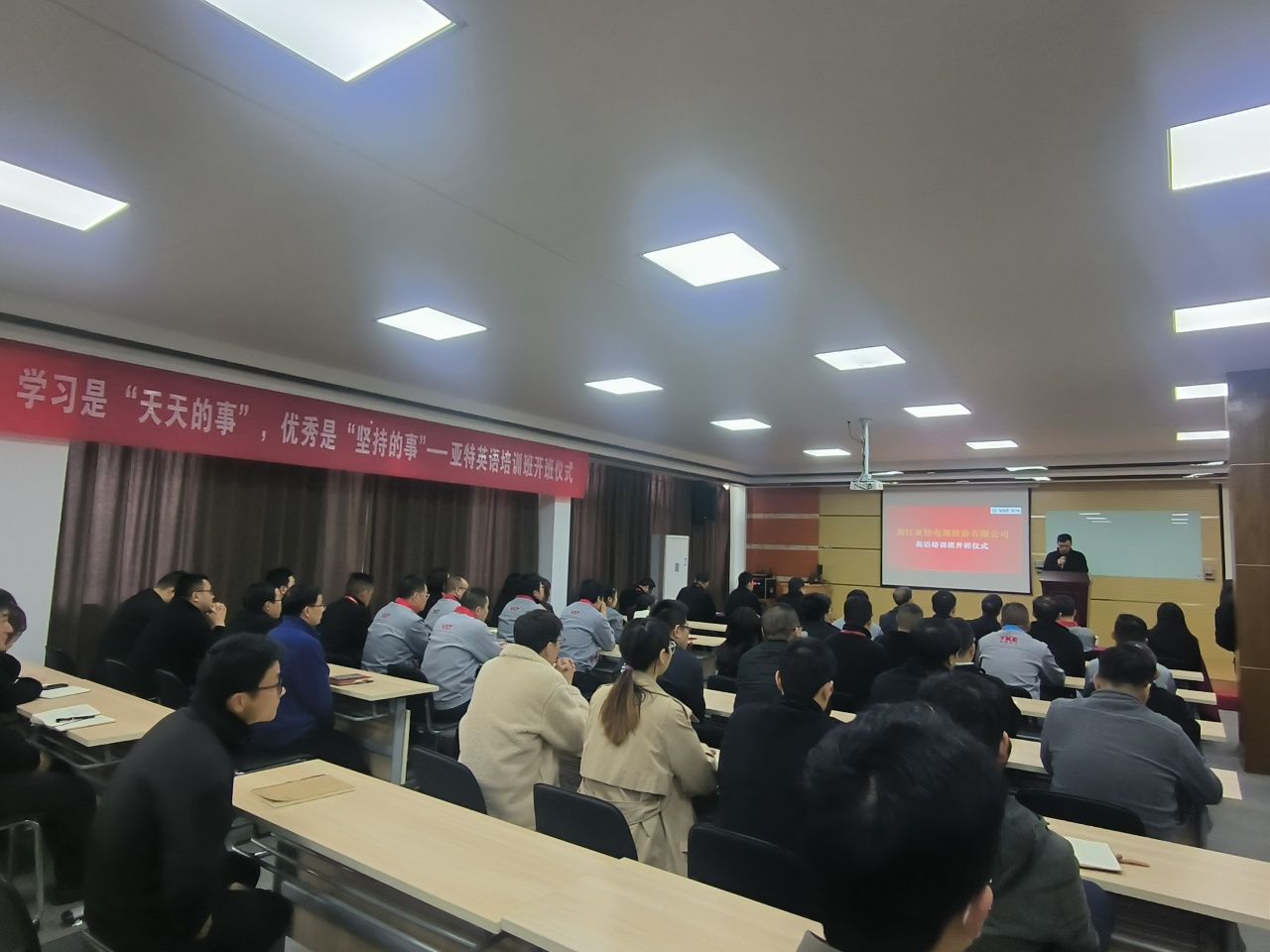 3月14日,由私房tv 与亚特电器股份有限公司合作举办的英语培训班开班。亚特电器股份有限公司董事长陈勇、副董事长兼营销总经理卢敏,私房tv 院长唐艳芳出席开班仪式。本次活动亚特电器股份有限公司领导及员工100多人参加开班仪式。、