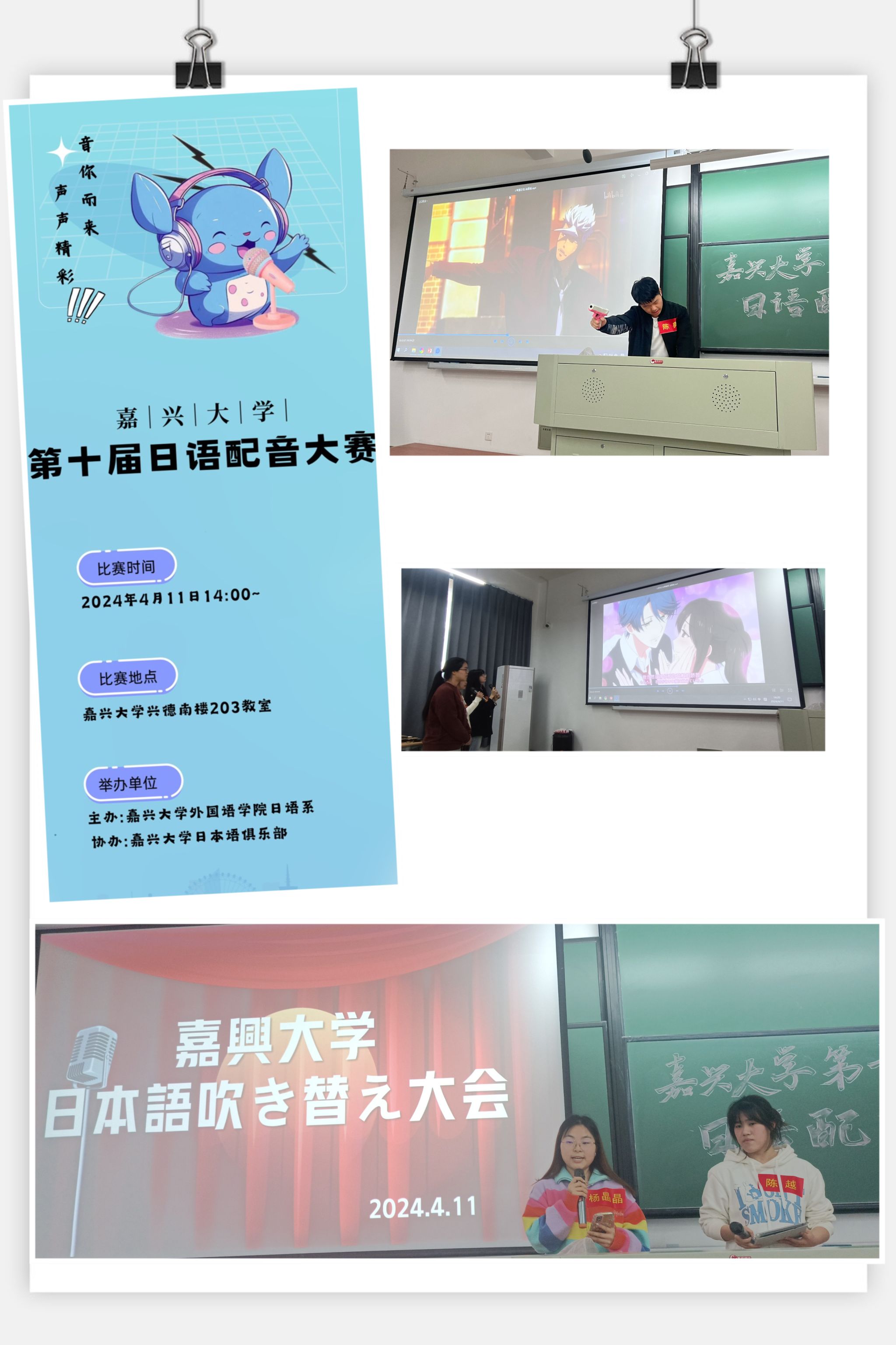 为了丰富大学生校园文化生活,锻炼同学们的日语应用能力,4月11日,日语系在兴德南楼203教室举办了“私房tv 第十届日语配音大赛”。来自日语专业和爱好日语的非日语专业同学11组共30余名同学报名参赛,郭永恩、张艳琴、金崎藍子、程建敏四位老师担任评委。
