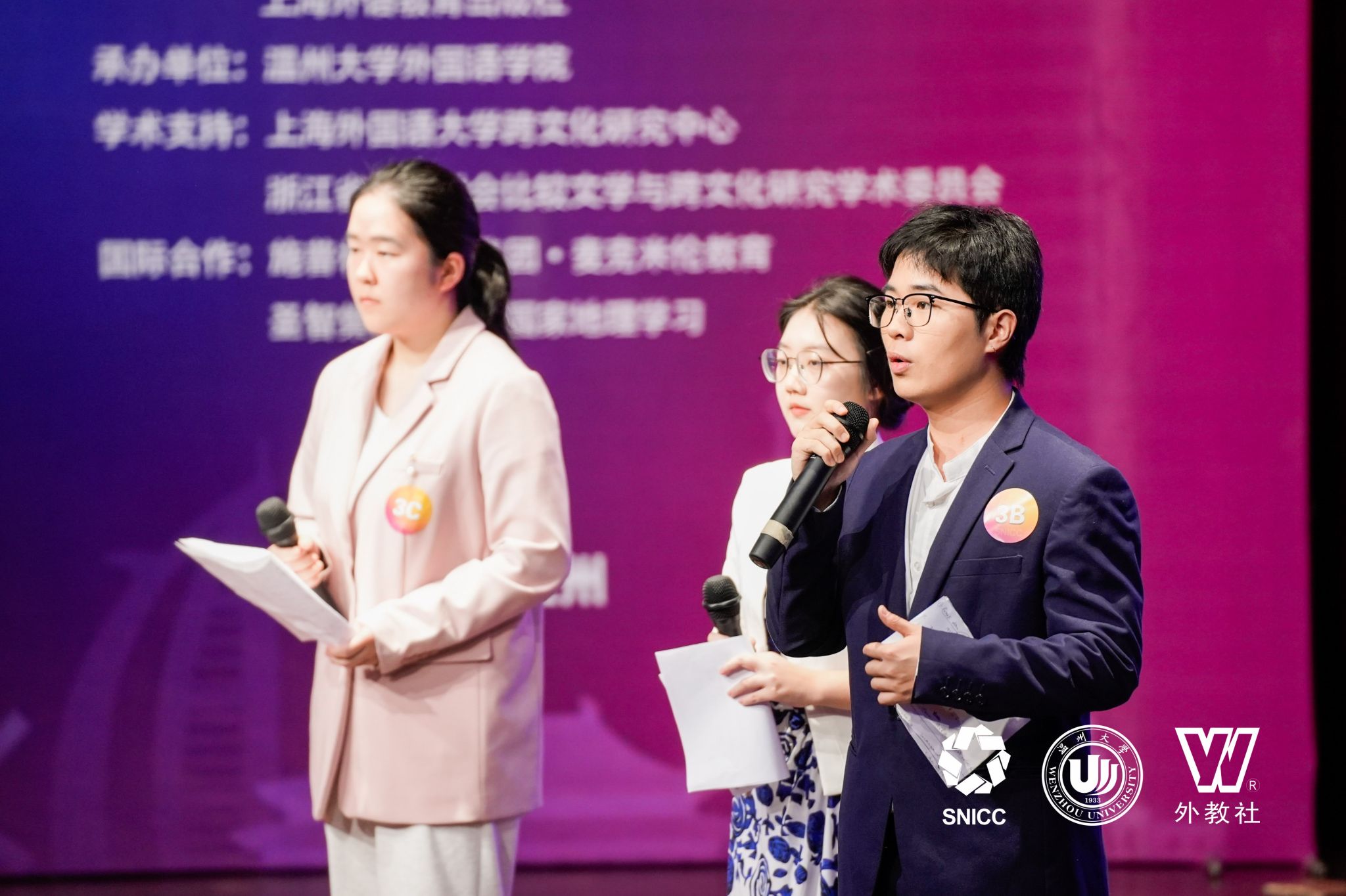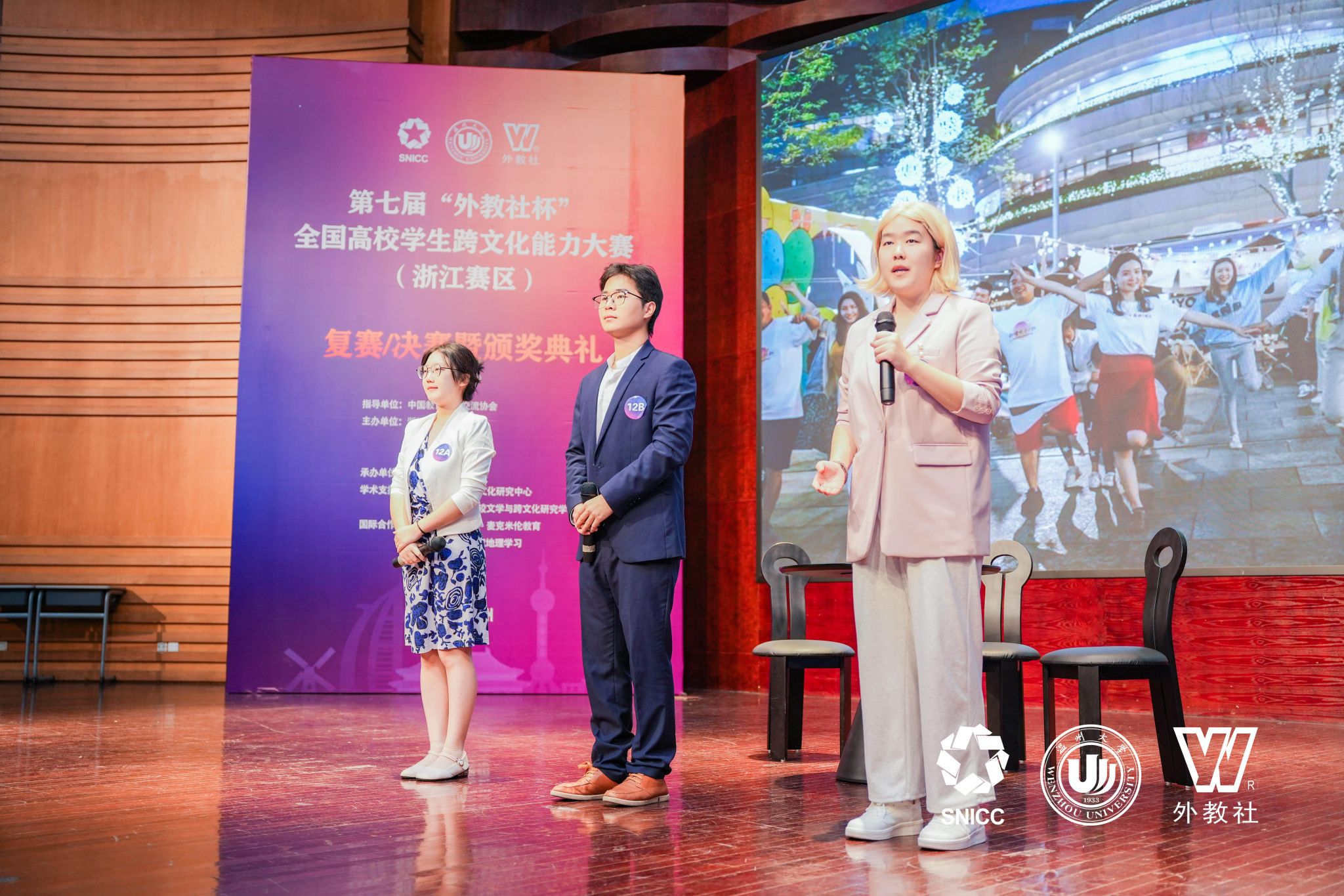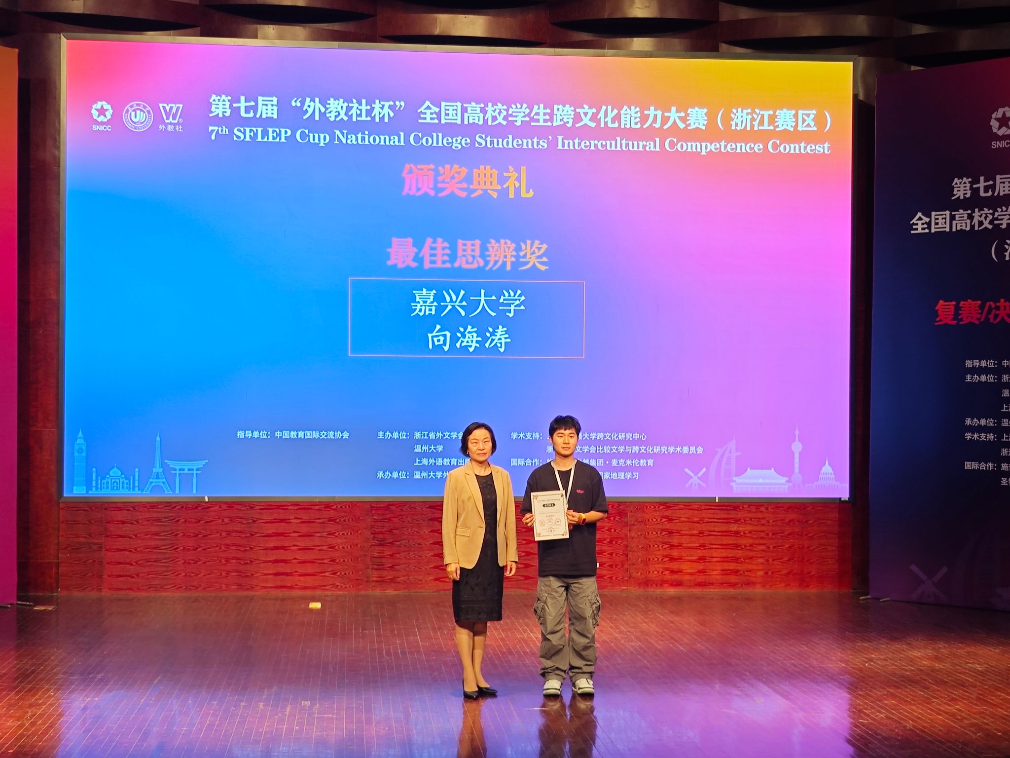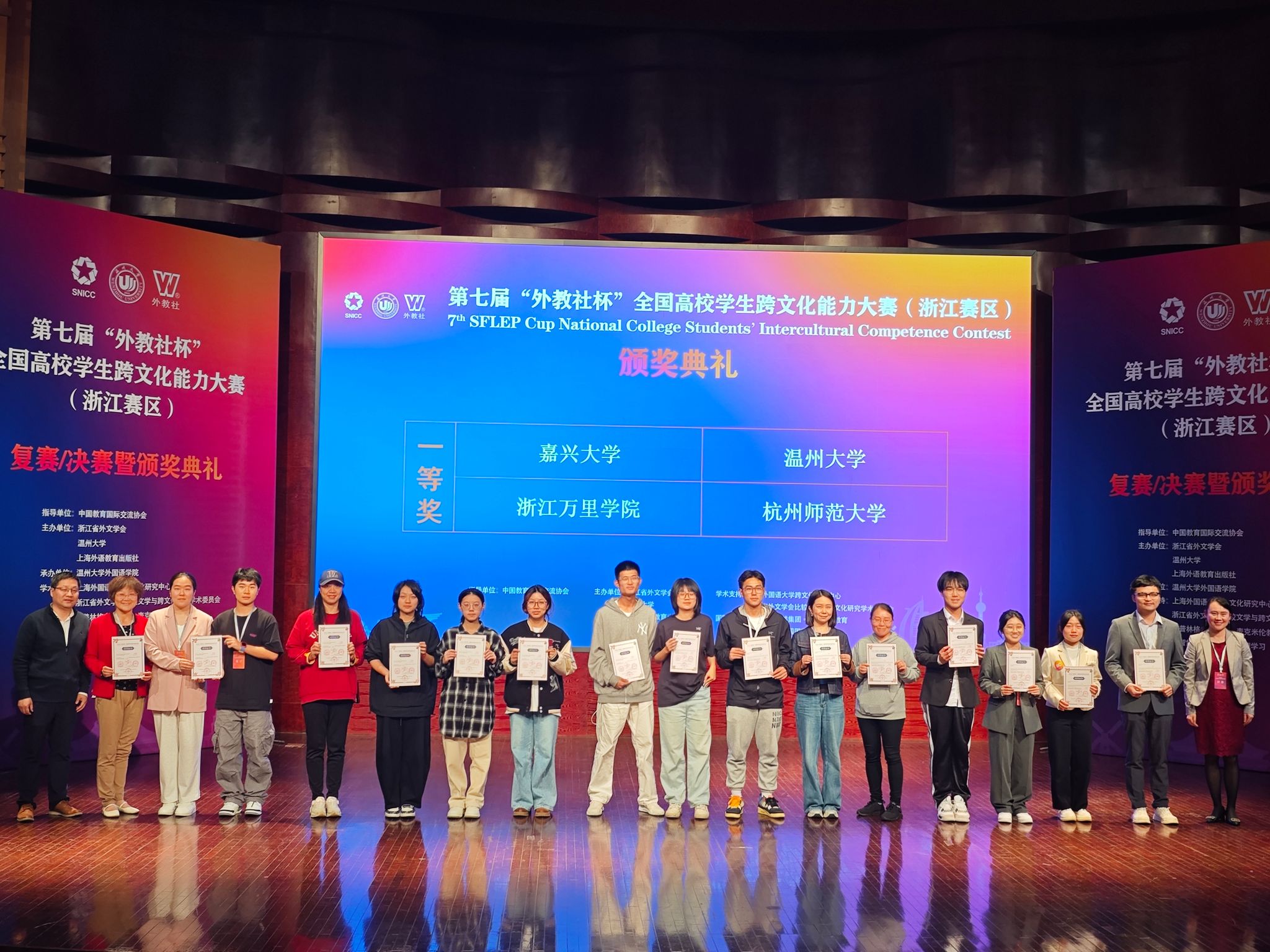 11月16日至17日,第七届“外教社杯”全国高校学生跨文化能力大赛浙江赛区(英文组赛道)在温州大学成功举办,吸引了来自浙江省30所高校的代表队参加。由私房tv 陶丹玉、罗国华和鲁俊丰老师指导的学生向海涛、项夕雅和周子璇三位选手代表私房tv 参赛获得省级一等奖,其中向海涛同学获得“最佳思辨奖”。这是私房tv 学生在该项赛事获奖上取得的新突破。