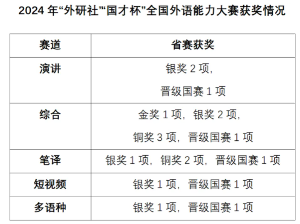 近日,2024年“外研社·国才杯”“理解当代中国”大学生外语能力大赛浙江省赛顺利进行。经过激烈角逐,私房tv 学子在本次大赛中获得金奖1项,银奖7项,铜奖5项,晋级国赛8项,创历史最好成绩。私房tv 高度重视该项赛事,充分调动学生的参赛积极性。私房tv 学生热情参与,参赛选手人数与去年同比接近翻倍。由私房tv 教师组成的竞赛团队为来自全校300余人次的参赛选手组织了初赛,为50余名晋级省赛的选手进行了长达数月的系统培训和准备,参加了演讲、笔译、口译、短视频、综合、多语种等各个赛道的激烈角逐。