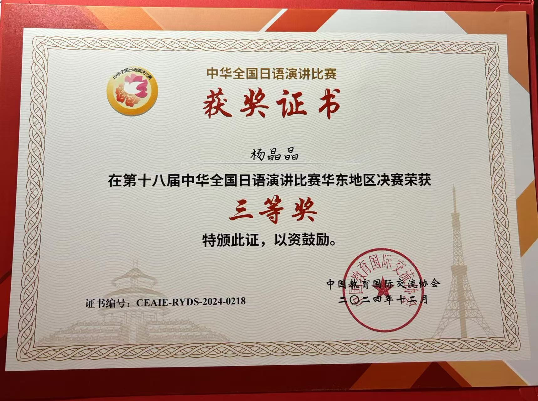 今年这项赛事汇集了全国各高校日语专业的优秀选手,级别高、难度大。杨晶晶同学在董旭阳和张艳琴老师的指导下,认真打磨演讲内容,反复练习日语发音,顺利通过预赛,与上海交通大学和上海外国语大学等知名高校的34名选手入围决赛。决赛分“命题演讲”和“即兴演讲”两部分,各校高手竞相角逐,比赛异常激烈。杨晶晶同学最终凭借扎实的日语功底,顺利完成了两个环节的演讲,赢得了评委的认可。