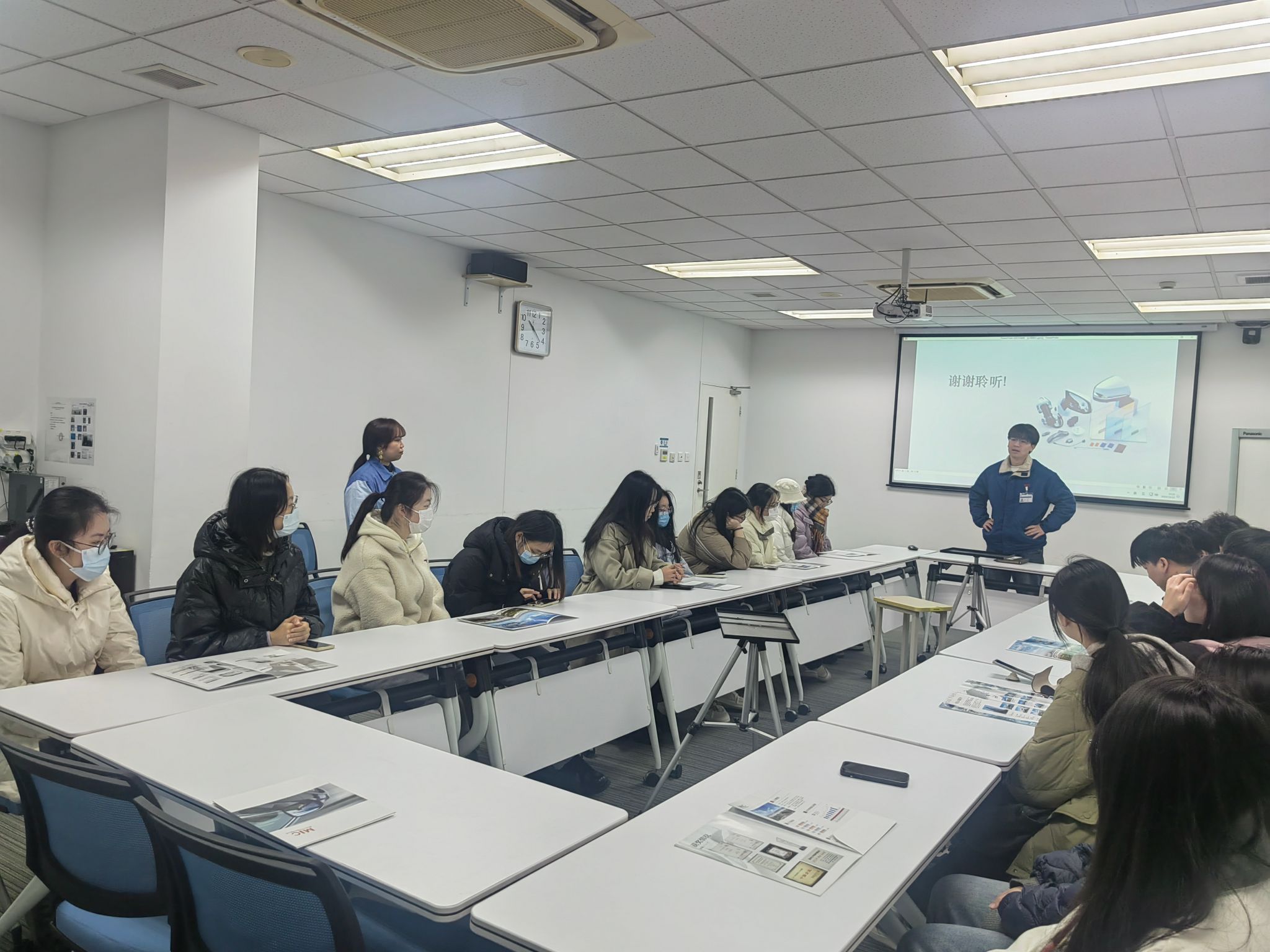 参观结束后,同学们还与公司相关人员进行了交流座谈。郭经理介绍了公司发展历史、经营理念、与供应商及客户合作的市场背景,特别是公司在跨文化交流中的实践经验。日语专业的学生们踊跃提问,就专业对接、就业岗位及行业前景进行了深入讨论。