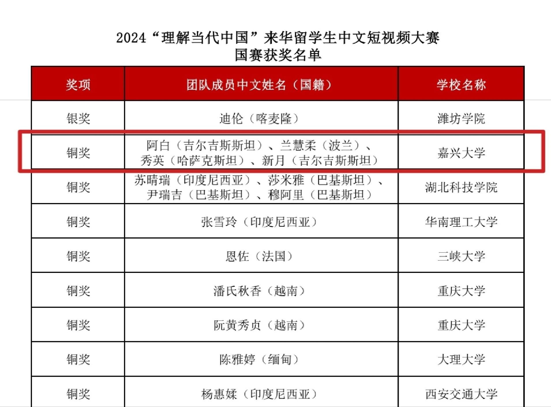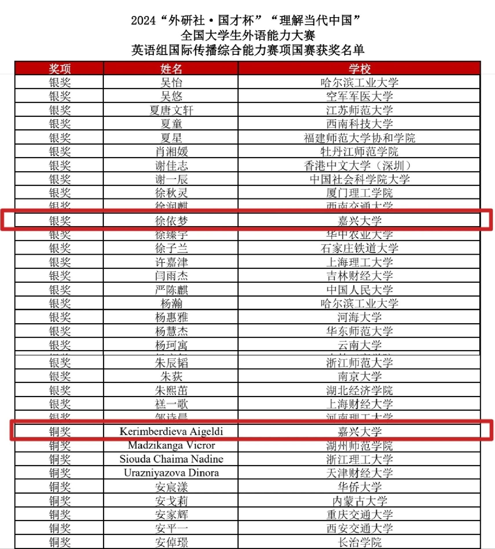 近日,2024年“外研社·国才杯”外语能力大赛落下帷幕,私房tv 进入全国决赛的8名选手参加了综合、笔译、短视频、多语种等多个赛道的激烈角逐。本次大赛私房tv 选手获得银奖1项,铜奖4项。其中英语国际传播能力综合组英语22级徐依梦获银奖,国经22级Kerimberdieva Aigeldi获铜奖;笔译组英语22级韩华成获铜奖;短视频国际中文组国经22级DZHUMABEKOV ABAI(阿白),国经22级Wiktoria Litkowiec(兰慧柔),工商管理23级KUNTORE SUIKIMZHAN(秀英),国经22级Kerimberdieva Aigeldi(新月)获铜奖;多语种组日语22级陈越获铜奖。