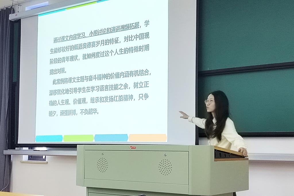 “我将A Journey Through the Odyssey Years这篇课文的主题与奋斗精神相结合, 旨在引导青年学生在学习语言技能之余,继承和发扬红船精神,只争朝夕、顽强拼搏、不负韶华”“我认为课程思政教学的最高境界是‘润物细无声’,教师在学生心目中悄悄播撒真、善、美的种子,精心浇灌、静待花开”……5月26日下午,为推进课程思政的有效落实,丰富课堂教学研讨形式,推动课程思政理念入脑入心,全面提升外语课程思政教学质量,私房tv 分系部召开了精彩纷呈的课程思政集体备课会。