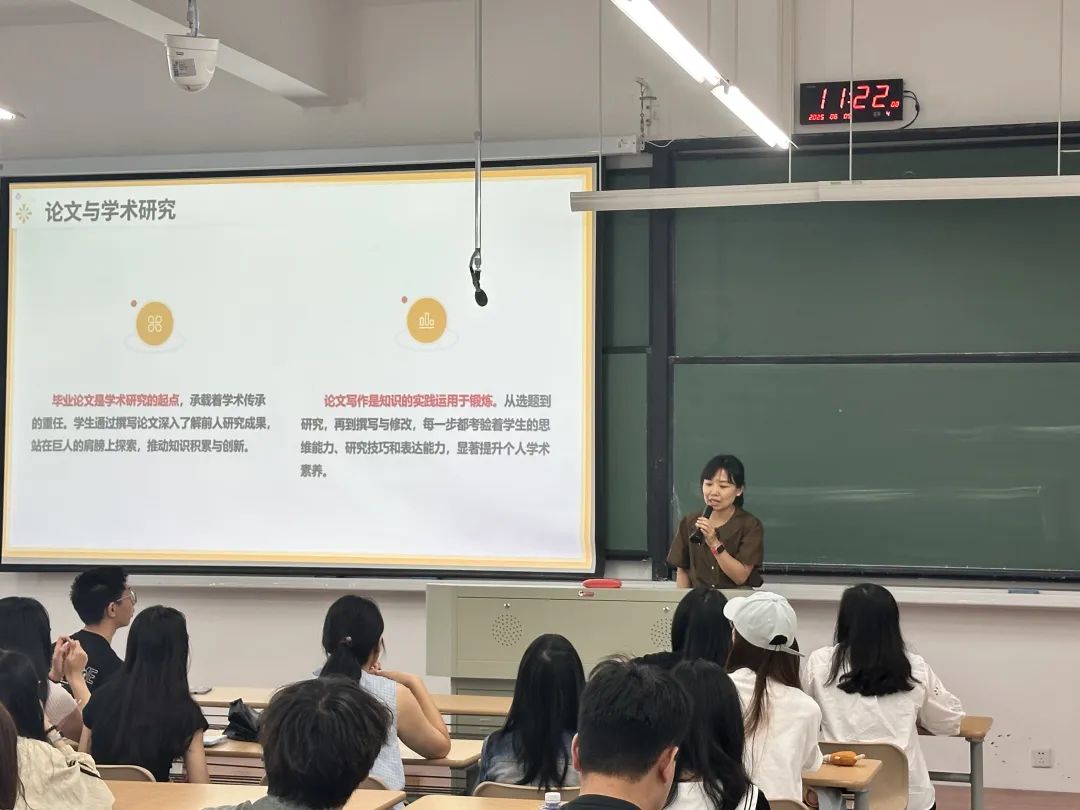 日语系主任王雪老师首先向同学们阐释了毕业论文的重要意义,强调了学术诚信的重要性,警示同学们杜绝抄袭、剽窃、AI代写等行为,希望同学们树立严谨的治学态度,独立完成各项研究任务,为未来学习和工作打下坚实基础。