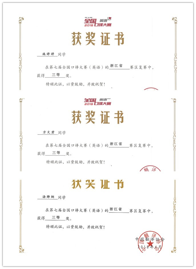 近日,由中国翻译协会、浙江省翻译协会、浙江省高等学校外语教学研究会联合举办的第三届“LSCAT杯”江苏省翻译大赛(笔译)和中国翻译协会主办的第七届全国口译大赛“LSCAT杯”浙江省赛区大赛落下帷幕,我院英语专业学生表现优异,在笔译大赛中获二等奖1名、三等奖2名、优胜奖2名;在口译大赛中获三等奖3名,充分展现了学生扎实的语言基本功和过硬的翻译能力。