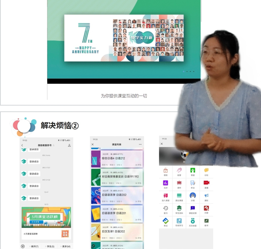 本次教学经验分享会邀请到本学期在公开课中得到师生一致好评的三位青年教师,她们结合教学实际案例分享了自己通过使用新媒体、新技术提高学生学习兴趣和教学质量的宝贵经验和技巧。陈陆琴老师以《微助教在教学中的基础应用》为题,主要介绍了微助教的特点、功能及具体实践,分享了如何利用签到、抢答、作业提醒、课后反馈互评等功能提高学生课堂参与兴趣。周云老师以“数字技术在大学英语课程中的应用探索与实践”为主题,从宏观上与大家探讨数字技术应用的必要性和数字技术与课程有机融合路径,并结合超星智慧教学系统展示了数字技术在大学英语和英语口语实训课程中的应用案例。吴嫣斐老师则立足微观角度,以青教赛参赛作品为例,从疑惑、初探、思考和改进四个方面,具体举例说明在课前、课中、课后如何将新媒体技术融入教学。吴老师还分享了她在现代技术融入教学实践过程中遇到的问题和不足,以及做出的改进。