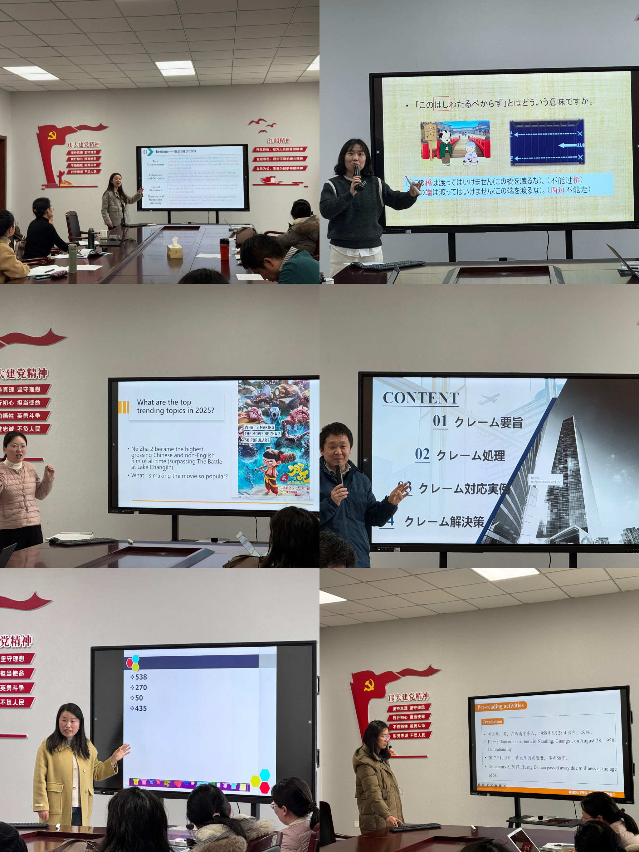 竞赛现场,六位参赛教师围绕各自专业特色,进行了精彩纷呈的教学展示。大外部邱宇蕾以《大学英语II》课程中“战略科学家黄大年”为案例,生动诠释家国情怀与学术精神的融合;高晨笛通过《雅思英语》的饼状图写作训练,构建数据可视化表达能力培养体系。英语系侯飞在《英语国家概况》中创新采用文化对比分析法,陆婷婷则以电影《哪吒2》这一当前热点话题为切入点,在国际网络营销课程中演绎跨境电商客户服务的实战策略。日语系教师王雪通过《日语阅读》解析汉字对日本文字体系的深远影响,董旭阳在《国际商务日语谈判》中创设仿真商务场景,全方位锻炼学生跨文化谈判能力。