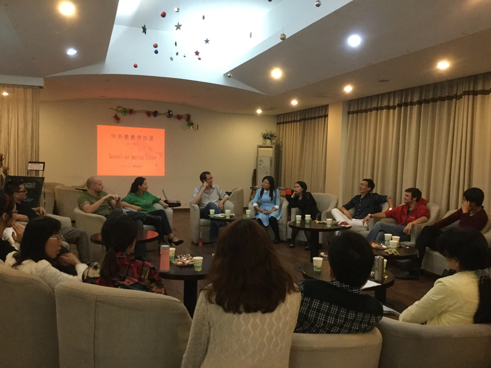 2015年10月23日晚上,私房tv 第一期中外教教学沙龙在咖啡吧如期举行。陶丹玉院长为新沙龙项目致辞,希望教学沙龙能为中外教师们提供一个良好的交流平台,进行中外文化以及教学模式之间的碰撞,从而更好地服务日常教学活动。本期沙龙主题为”Baseball and American culture”,由 Peter主讲, Marcus和Stephen两位外教配合补充。私房tv 20多名教师及一部分学生参加了此次活动。Peter从Baseball在生活中的重要性谈到了它在美式英语中的重要性,教师们问题不断,现场气氛十分活跃,老师们纷纷表示此次活动收获颇丰。中外教师教学沙龙是私房tv 本学期新开设的沙龙项目,今后将长期定期举行,成为私房tv 中外教师交流学习的一个重要窗口和平台。