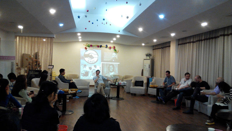 虽然正逢校运会召开之际,但白天角逐运动会的疲累并未阻碍私房tv 中外教师们交流文化与教学的热情。2015年11月6日晚上六点半,私房tv 第二期中外教教学沙龙在咖啡吧如期举行。本期沙龙由 Stephen主讲,主题为“A Very Quick Overview of Black and White American History”。他精心选择了大量原汁原味的图片资料制作了PPT,声情并茂地引导大家回顾了美国的历史,从穿着、语言发音、受教育情况、社会流动性、家庭结构、对待政府的态度等多个角度举例说明了美国白人与黑人的不同。Marcus、Caleb、Dave、Jacob等四位外教与二十来名中教不断发问、补充,与Stephen一道探讨相关话题。现场气氛和谐而热烈,沙龙进行到九点左右才结束。中外教及旁听的学生纷纷表示本期沙龙非常精彩,已经开始期待下一期沙龙的到来。