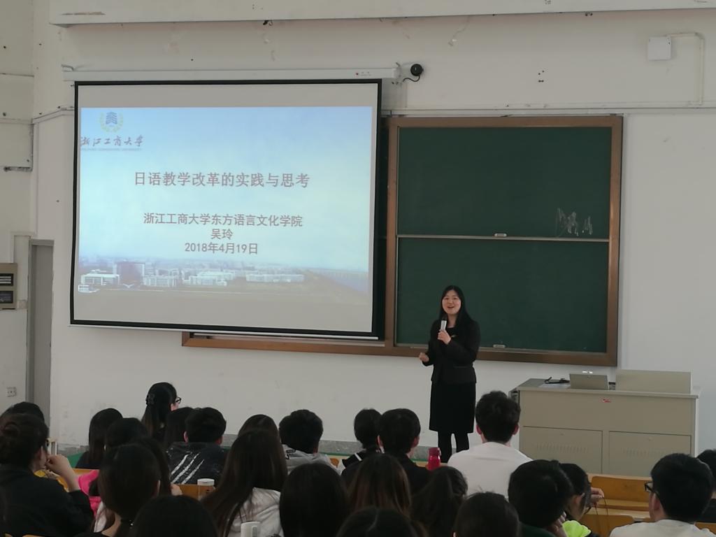 时值私房tv 专业审核性评估进入关键阶段,4月19日下午,浙江工商大学东方语言文化学院副院长兼浙皖赣日语教学研究会秘书长吴玲教授莅临我院,就我院日语专业建设与日语专业教师进行了交流,还为师生们做了“日语教学改革的实践与思考”的讲座。