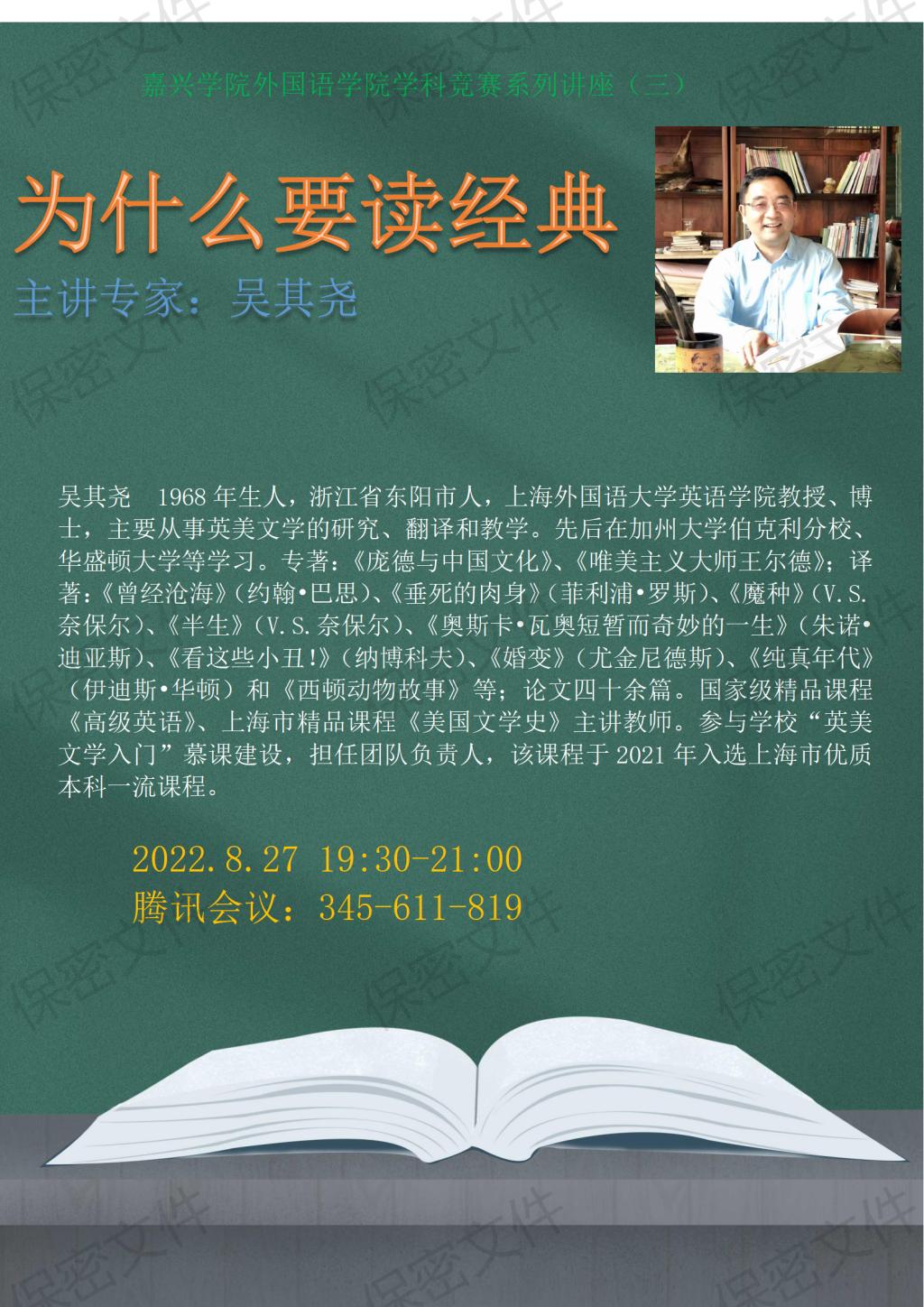 2022年8月27日晚7点30分,上海外国语大学吴其尧教授为我院师生举办了一场题为《我们为什么要读经典》的线上讲座。吴教授从大学教育需要有开明的文化修养、开阔的视野、历史的视角和哲学的氛围谈起,论述了“什么是经典”、“为什么要读经典”,以及“如何读经典”三个方面的问题。吴教授认为,经典必须具备如下四个特点:1,应该具有内涵的丰富性,是对人的处境有真切的关心,是对人的命运有深刻的体察,是对人的内心经验有感同身受的体谅和同情;2,应该具有实质的创造性;3,应该具有时空的跨越性;4,应该具有无限可读性。讲座中吴教授古今中外的文学经典信手拈来,用大量生动、富有启发意义的经典文本带领师生们走进一场学术盛宴。讲座中吴教授和师生们即时互动,并解答了师生们的问题。