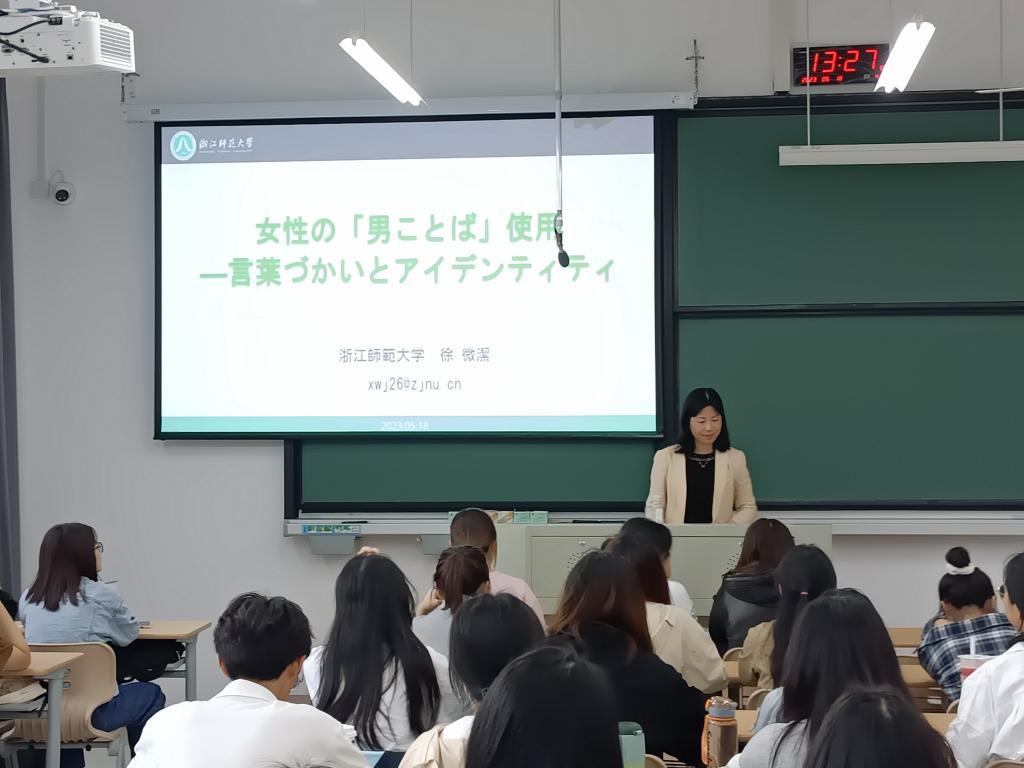 2023年5月18日下午,浙江师范大学私房tv 副院长徐微洁教授面对日语专业师生做了“基于语言使用和身份认同的视角”的学术讲座,之后又专门给日语专业全体教师做了题为“关于中华学术外译项目申报的一点思考”的科研指导。私房tv 副院长兼日语专业负责人郭永恩教授主持了学术讲座和科研指导报告会。