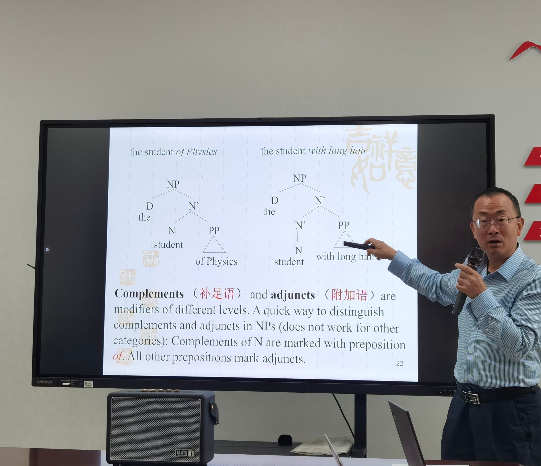 韩教授以名词组中修饰语的三层次分析法为例,详细说明了如何进行细致和深入的语言学研究。他强调,语言学研究需要有充分的准备,包括扎实的理论基础、科学的研究方法和准确的事实依据。他还分享了自己在生成句法学和语义学领域的研究经验,鼓励教师们勇于探索语言学的深层次问题。