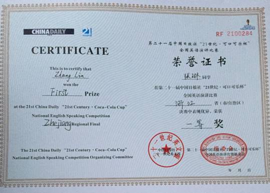 第21届中国日报社“21世纪·可口可乐杯”全国英语演讲比赛浙江省决赛于12月5日在浙江大学城市学院举行,来自全省各个高校的36名选手参与角逐。嘉兴学院派出私房tv 英语122班张琳同学参赛,她在大赛中表现优秀,从众多参赛选手中脱颖而出,获得一等奖的佳绩!