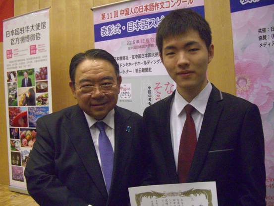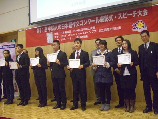 12月12日下午,日本外务省、日本国驻华大使馆、中国日本商会支持,东芝国际交流财团、朝日新闻社赞助、“日中交流研究所”及《日本侨报社》主办的第11届“中国人日语作文大赛”颁奖仪式在北京日本驻中国大使馆举行。嘉兴学院日语131班牛宝伦同学的作文《日中青年交流について――私達の現状を理解してほしい!障害を乗り越えて仲良く交流しよう》荣获三等奖,日语121戴蓓蓓、日语122方啸・朱杭珈、日语131陈子轩・霍思静等5名同学获得佳作奖。日籍教师照屋庆子荣获优秀指导教师称号。