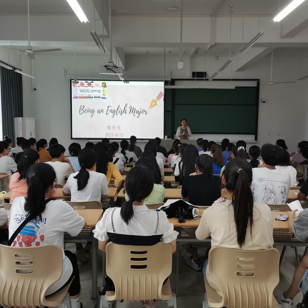 9月11日上午,新生入校始业教育的第二天,私房tv 英语专业负责人陶丹玉教授以“Being an English Major”为题在兴德南楼203教室为全体英语专业2021级新同学上了第一堂专业入门课。