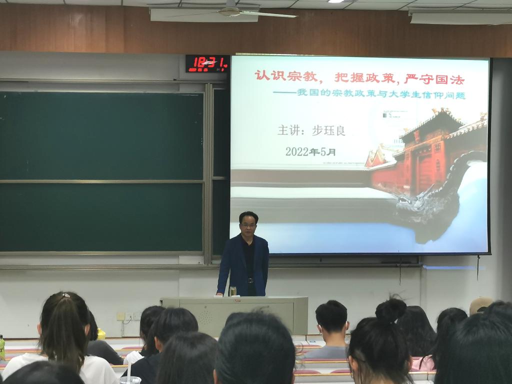 为全面贯彻落实党的民族宗教政策,进一步指导新生全面系统地了解宗教知识,树立正确的宗教观念,私房tv 于5月25日晚在博闻楼报告厅举办了2021级新生宗教政策专题讲座。本次讲座特别邀请了步珏良副教授主讲,私房tv 2021级全体新生参加了此次讲座。