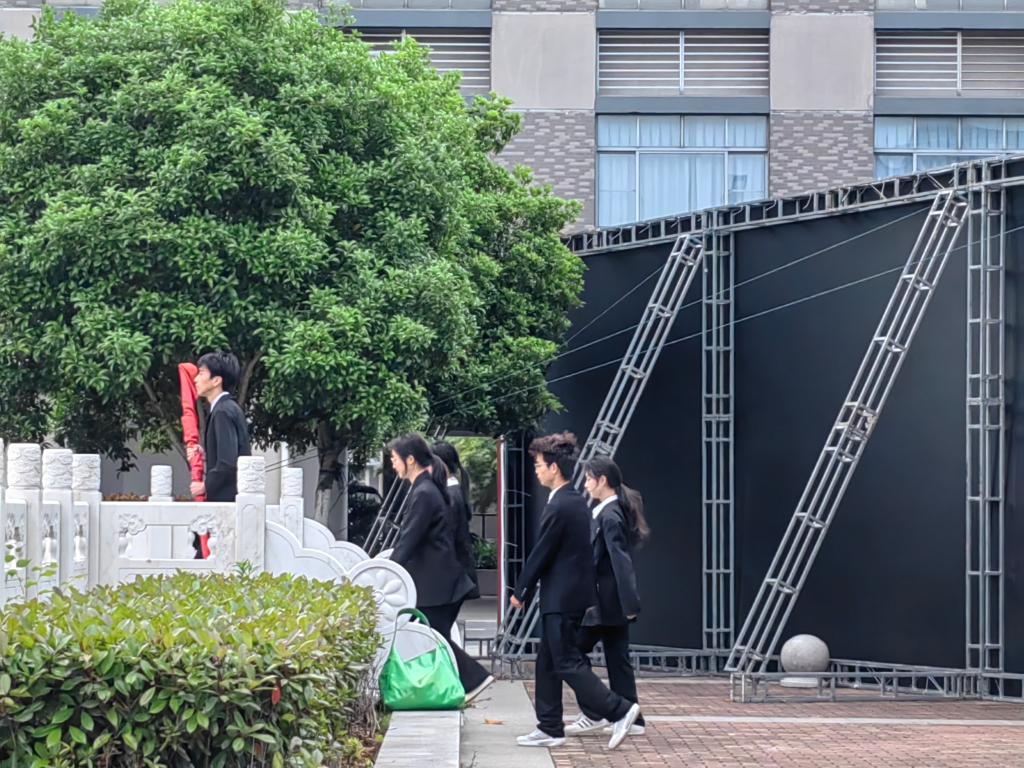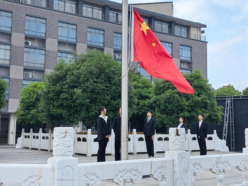 7时,全体师生行注目礼,国旗班成员踏着整齐划一的步伐走向旗台。在慷慨激昂的国歌声中,五星红旗冉冉升起,迎风飘扬。