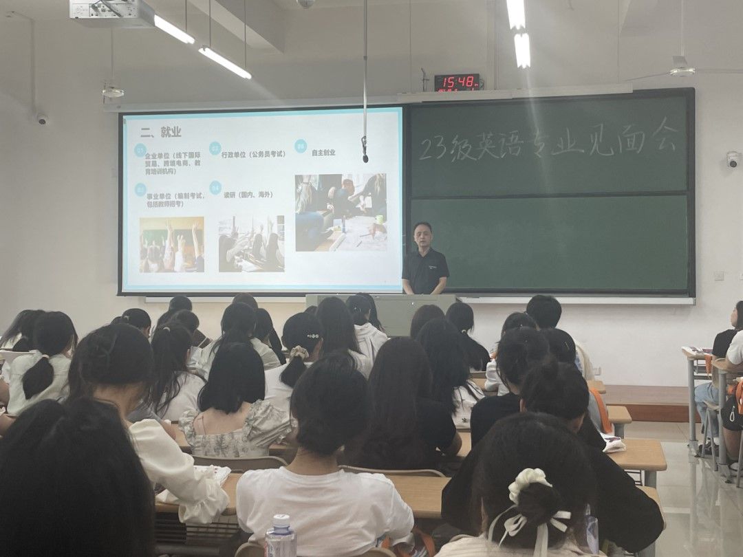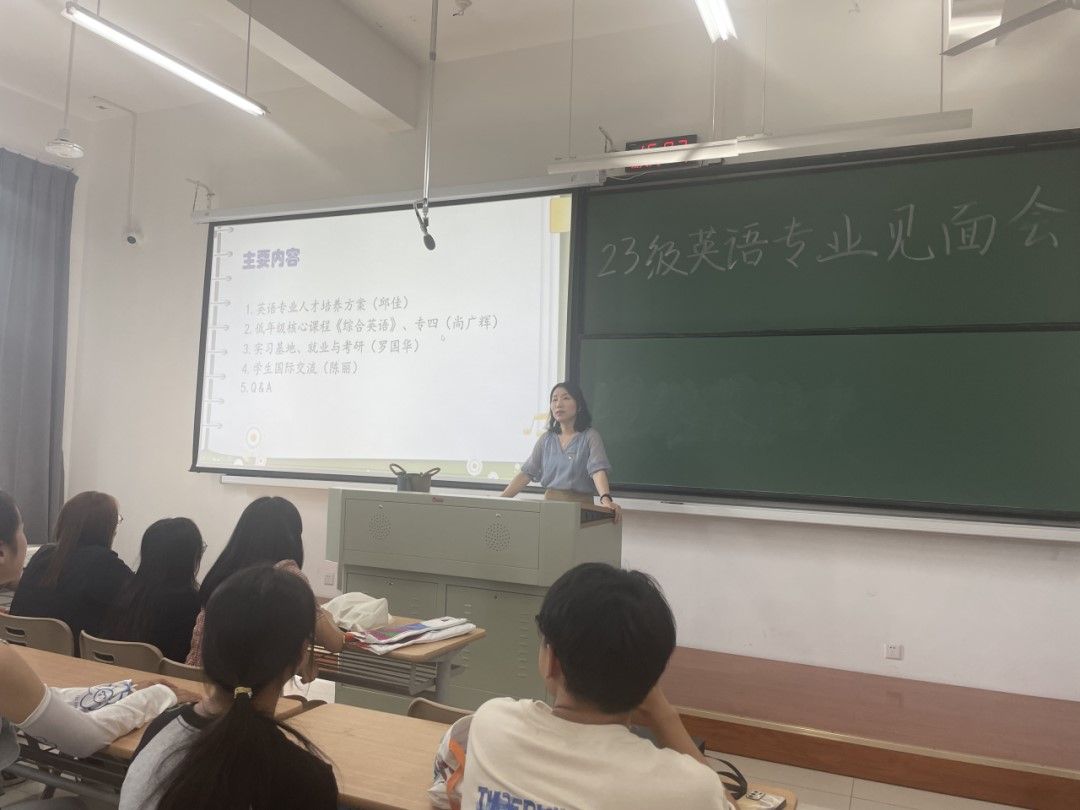 又是一年开学季,正是橙黄橘绿时。美丽的嘉院迎来了90位来自祖国四面八方的英语专业新生。他们怀揣梦想,带着憧憬,走进私房tv ,开启了新的人生之旅。为帮助新生更快适应大学生活,2023年9月10日下午,英语系在兴德楼123举办2023级英语专业新生见面会。会议由英语系主任邱佳博士主持,英语系尚广辉老师、陈丽老师、罗国华老师等出席。他们从人才培养方案、基础英语学习、专业等级考试、实习就业、考研留学等方面与新生做了面对面交流。