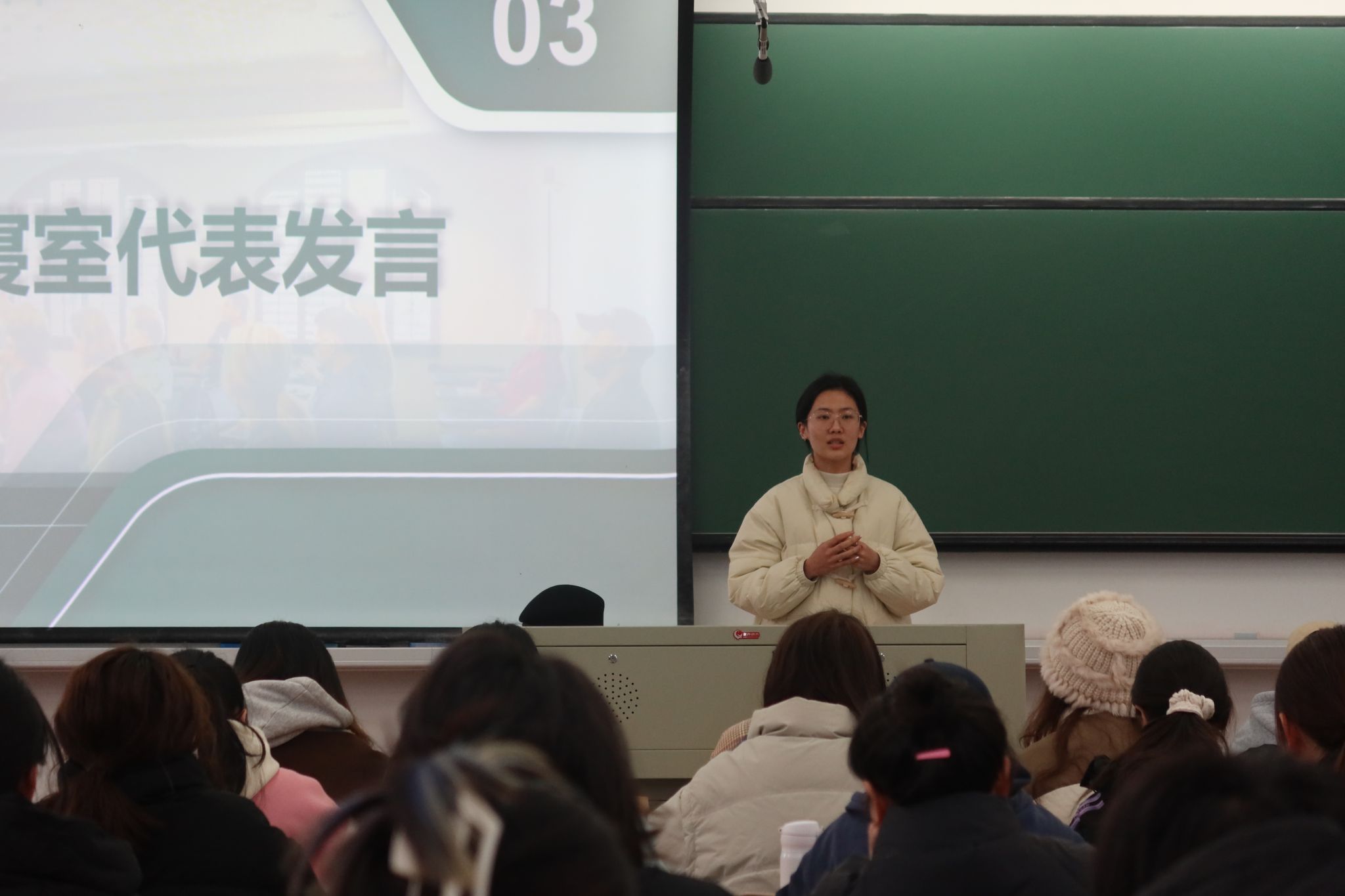 日语221单文倩同学和英语212郑姣姣同学作为优秀寝室代表分享她们管理寝室的心得,从卫生安排、寝室规章制度、寝室氛围等方面详细介绍了自身寝室的管理经验,并指出寝室长肩负的责任和使命,要严格做到认识到位、组织到位、管理到位、落实到位,心系宿舍全体成员。