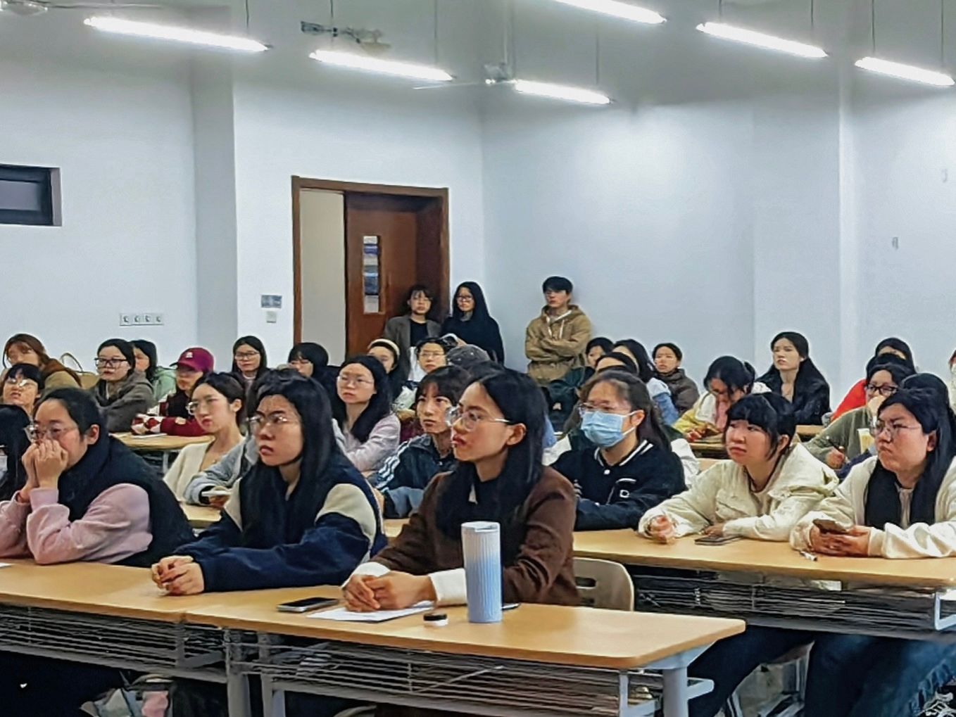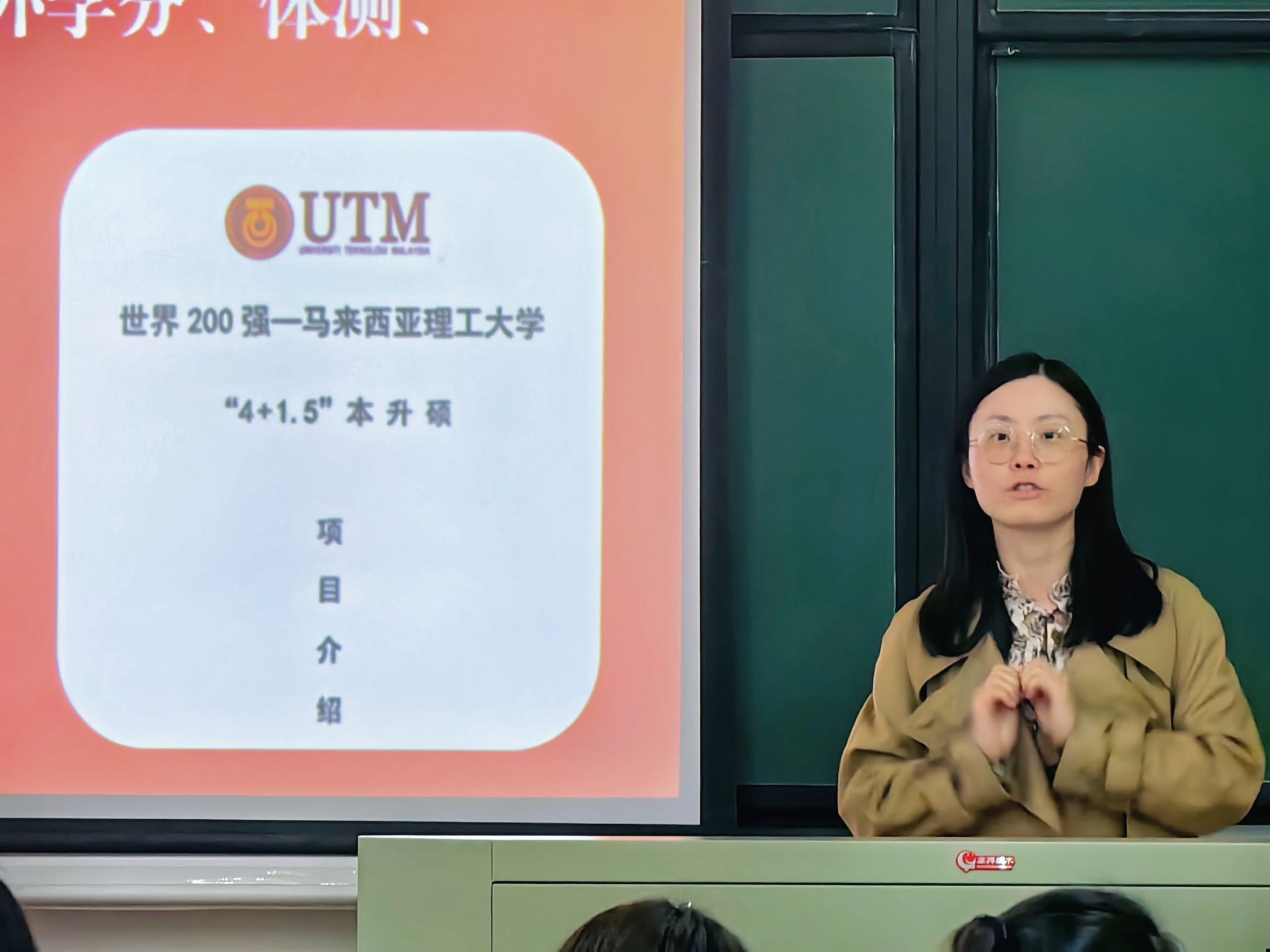 英语系副主任潘宁宇与就业辅导员胡笳丽为毕业生讲解毕业论文安排与分析当前就业形势,并建议要明确自身定位,合理规划个人职业发展路径。