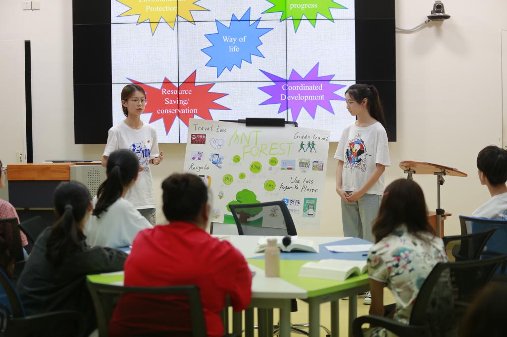 本次读书研讨会采用分享与研讨的方式进行,全英文交流,党员教师通过《习近平谈治国理政》外文版本的课堂导读,引导学生围绕主题学习闪耀马克思主义哲学光辉的理论创新成果。私房tv 党委书记陶丹玉围绕“文明因交流而多彩,文明因互鉴而丰富”的主题为学生生动阐述了文明多彩、平等、包容的魅力所在,从多个角度展现文化自信给一个国家和一个民族带来的更深沉、更持久的力量,激发了现场同学对文明多彩、平等、包容的多视角分享与感悟。党员教师边娜为同学们展现了“共同构建人类命运共同体”的壮阔蓝图,“善学者尽其理,善行者究其难。”教工第三党支部书记鲁俊丰以“推动形成绿色发展方式和生活方式”的课堂主题,循序渐进带领同学们走进绿色生态的大门,鼓励同学们培育和践行绿色文化的自觉性。