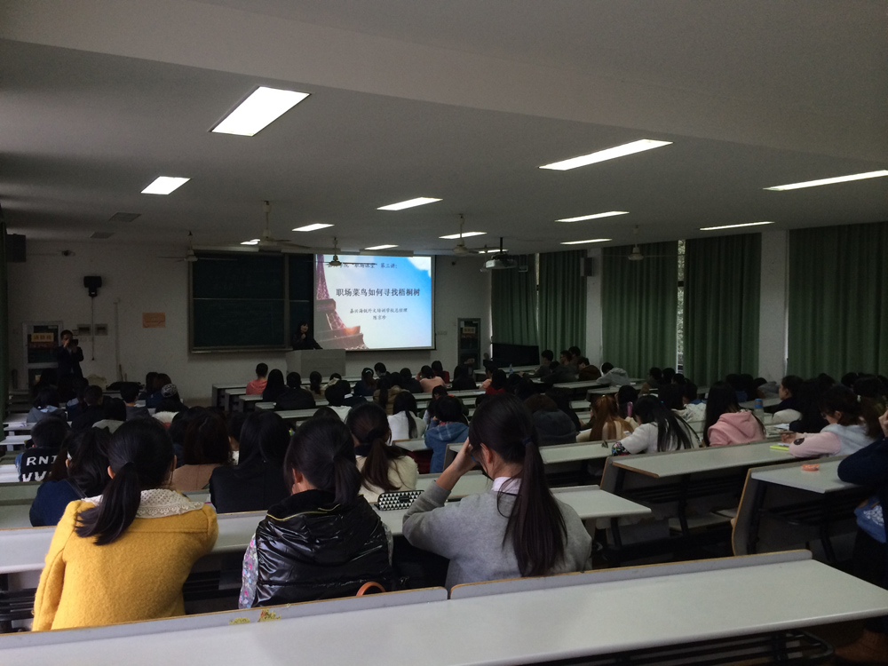 11月27日下午3:30分,由私房tv 承办的嘉兴学院“职场课堂”第三讲在教二A225举行。此次“职场课堂”邀请到了嘉兴市海锐外文培训学校总经理陈京珍主讲。