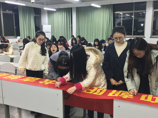 大会上,工作人员分发了活动的宣传彩页。主持人详细介绍了阳光晨读的各项活动内容,包括“书声朗朗”、教师伴读、每月交流板展示、 “每天一小时”采访以及个人奖励活动等。而每月学院微信平台和院报都将更新以晨读为主题的内容,分享同学们的晨读经验和感想。另外,晨读也将与班团考核紧密结合起来,缺勤率最少的前三名班级将获得加分。新颖多样的活动令人耳目一新,极大地激发了学生的兴趣和动力。最后,主持人带领全体同学进行动员宣誓,整齐一致的口号令人精神抖擞,而大会也在秩序井然的横幅签字活动中画下了圆满的句号。