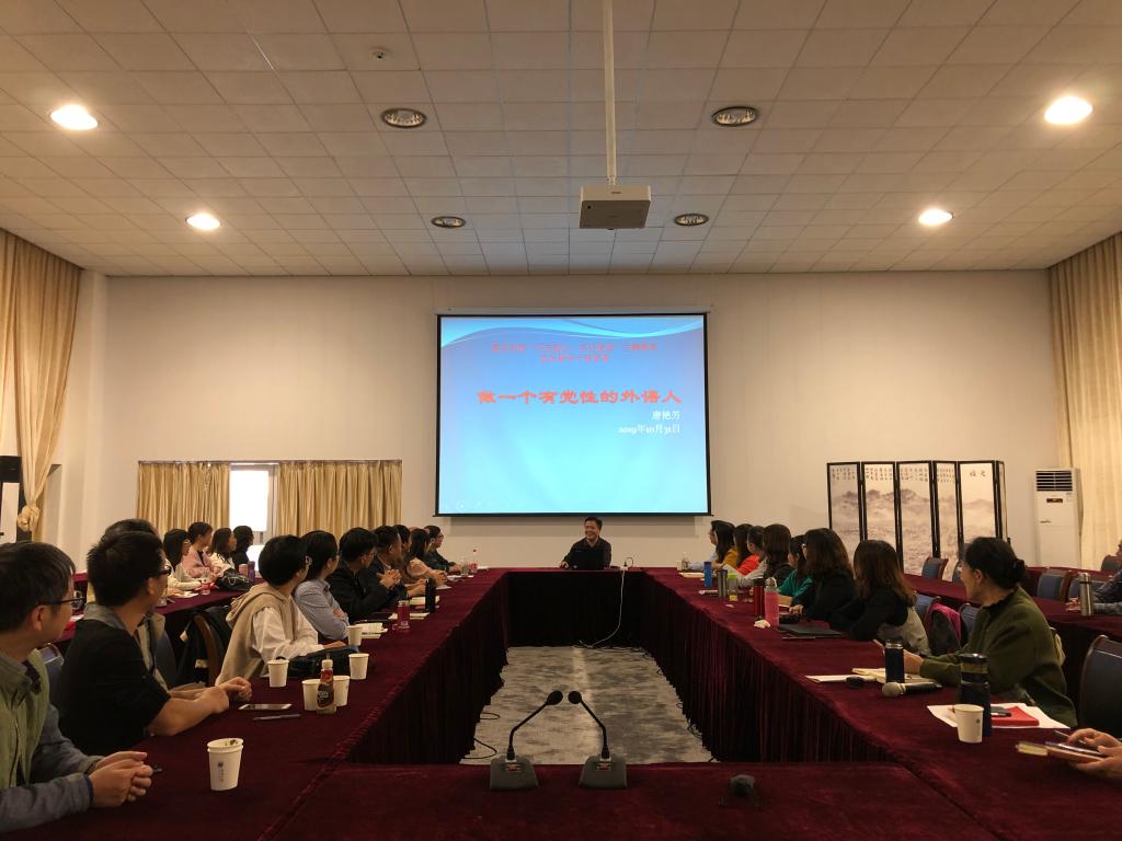 为扎实推进“不忘初心、牢记使命”主题教育活动,进一步贯彻落实“守初心、担使命、找差距、抓落实”的总要求,10月31日下午在学校第六会议室,私房tv 院长唐艳芳结合前期学习教育和调研情况,为全院师生党员上了一堂题为“做一个有党性的外语人”的专题党课。全院师生党员到场聆听党课。
