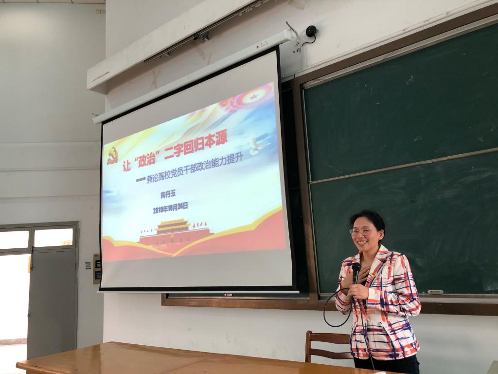 为扎实推进“不忘初心、牢记使命”主题教育,落实上级党委主题教育实施意见,10月24日下午在外语楼310会议室,私房tv 党委书记陶丹玉给全院师生党员上了一堂以“让‘政治’二字回归本源——兼论高校党员干部政治能力提升”为题的专题党课。全院师生党员到会听课。