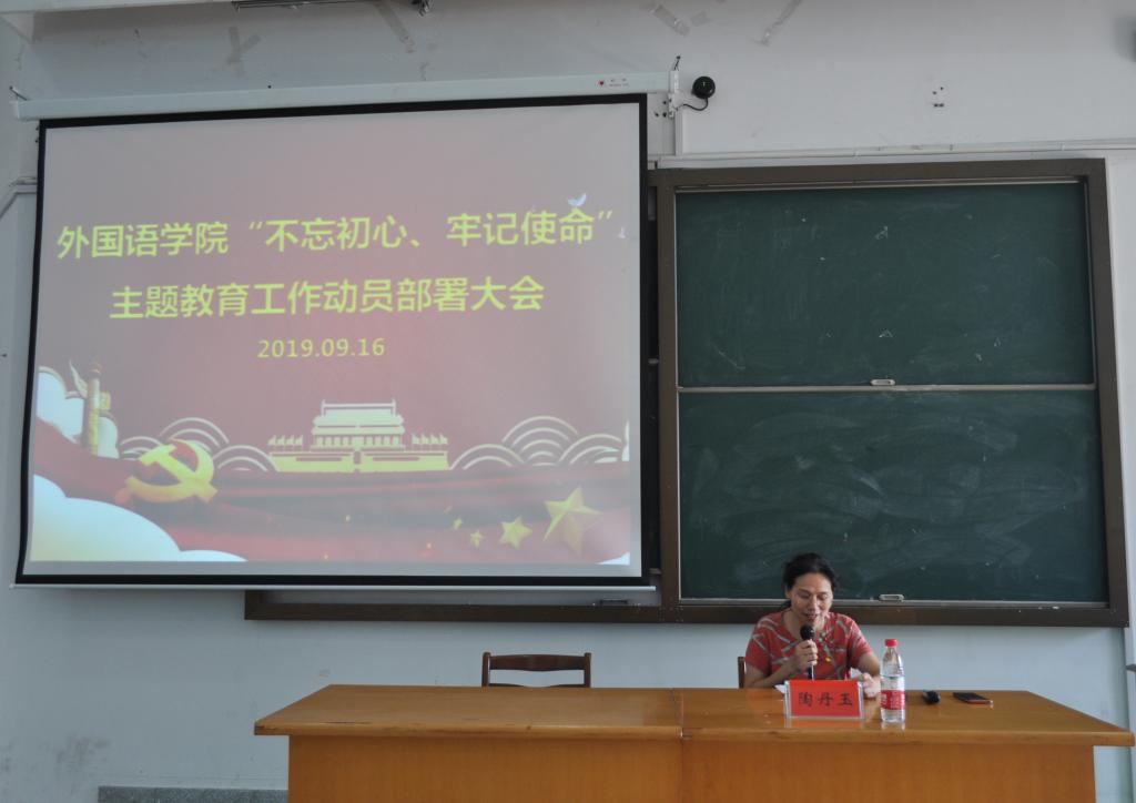 9月16日中午,私房tv 在外语楼310召开“不忘初心、牢记使命”主题教育工作动员部署大会,深入贯彻落实中央和上级党委主题教育相关会议精神,特别是习近平总书记和省委、市委、学校党委领导的重要讲话精神,对学院开展主题教育进行全面动员部署。校党委组织部副部长、嘉兴学院“不忘初心 牢记使命”主题教育领导小组材料组组长张向阳参加了会议。院党委副书记、院长唐艳芳主持,院党委书记陶丹玉做动员讲话。
