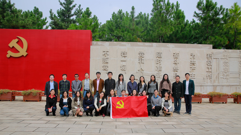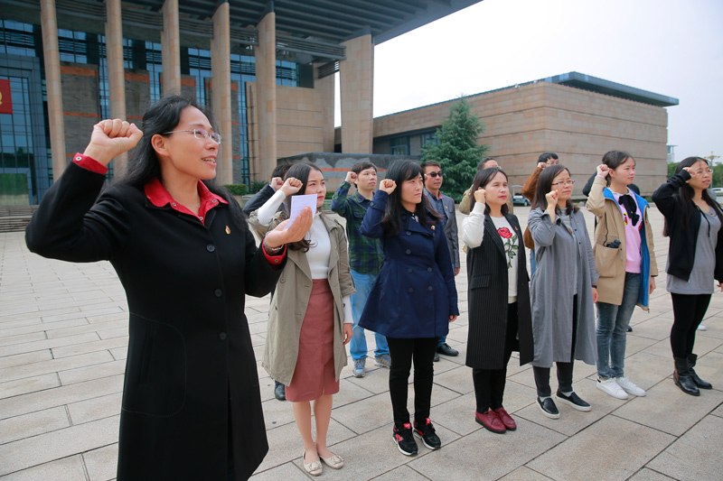 10月17日上午,私房tv 党委组织师生党员来到南湖革命纪念馆,面向党旗重温入党誓词,以特别的方式迎接党的十九大召开。参加此次宣誓活动的有党委书记陶丹玉、院长唐艳芳、党委副书记周钰、私房tv 其他党委委员以及党员老师和部分党员学生。