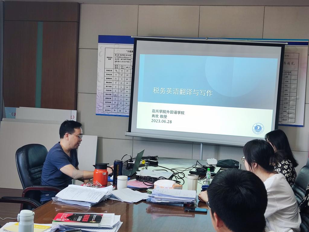 6月28日,全国高校党建工作样板支部培育创建单位、私房tv 英语系肖欢教授受邀前往嘉兴市税务局,为即将参加浙江省税务系统外语人才岗业务比武的税务干部,开展了“税务英语翻译和写作”的赛前培训。作为教育部人文社科研究项目主持人、浙江省一流本科课程《英语口译》负责人、翻译硕士研究生导师,肖欢教授的英语教学和实践经验十分丰富,曾发表高水平论文多篇、出版学术译著多部,指导学生在韩素音国际翻译大赛、浙江省LSCAT笔译大赛中斩获大奖。此前党史学习教育活动期间,肖欢教授就曾受邀前往嘉兴市税务局,面向税收研究翻译基地的骨干成员作题为“大数据环境下的计算机辅助翻译”的专题讲座。