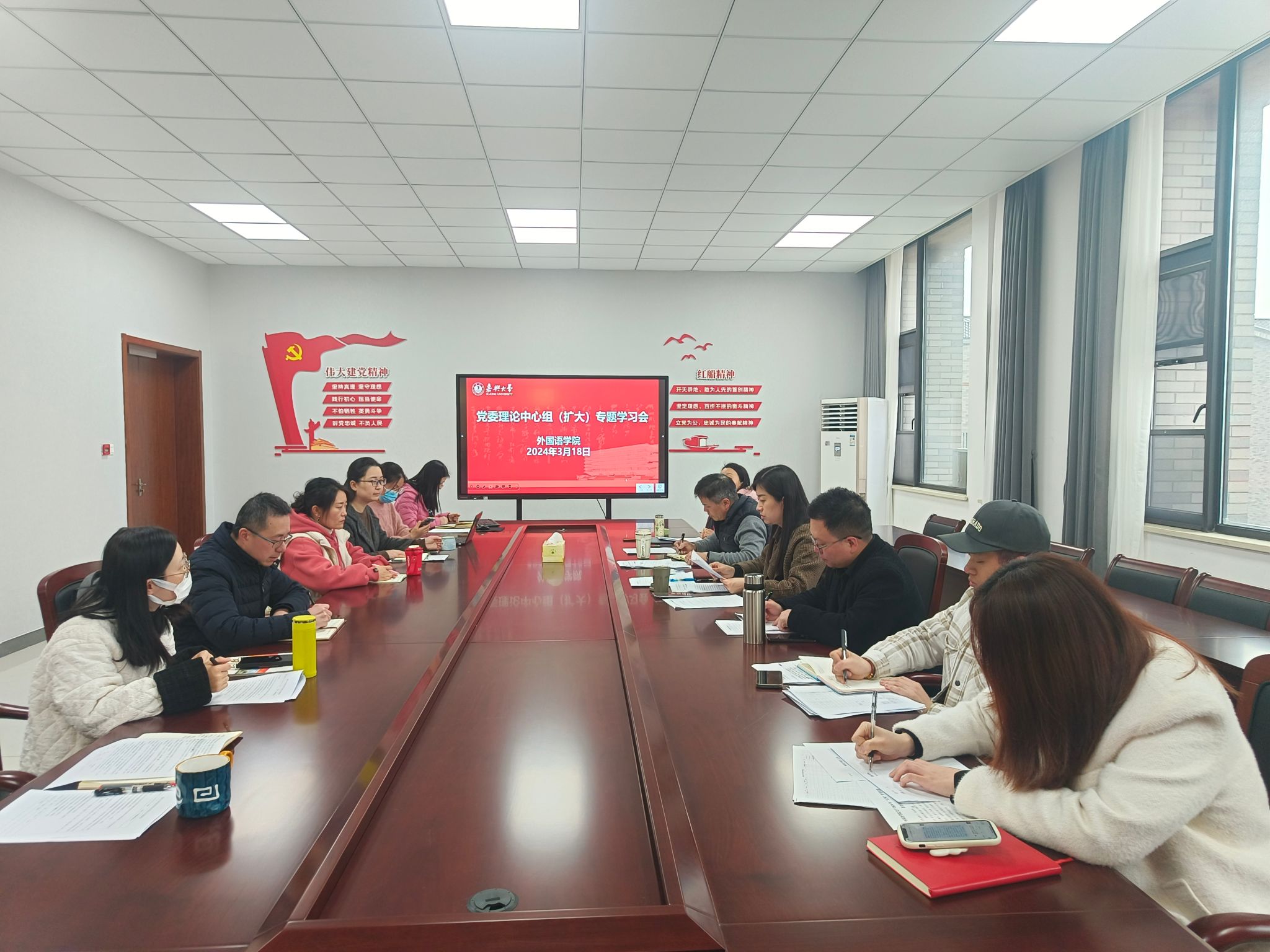 3月18日,私房tv 在兴德楼南楼516召开党委理论学习中心组(扩大)会议,深入学习习近平总书记在全国两会期间的重要讲话精神和十四届全国人大第二次会议精神、全国政协十四届第二次会议精神以及全省、全市领导干部会议精神,并就学习贯彻作出工作部署。学院党委书记周钰主持会议并领学,学院党政班子成员、科级干部、党支部书记、系主任以及民主党派代表参加学习会。
