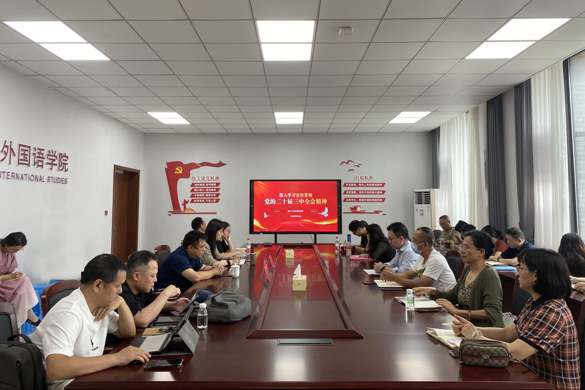 2024年9月24日下午,私房tv 邀请马克思主义学院马赛教授做题为“深入学习贯彻党的二十届三中全会精神”的理论宣讲,讲座由学院党委书记周钰主持,学院教职工代表参加。