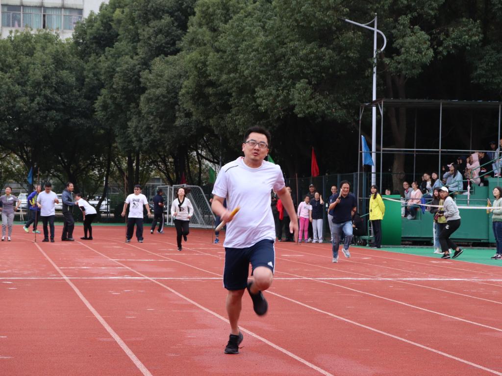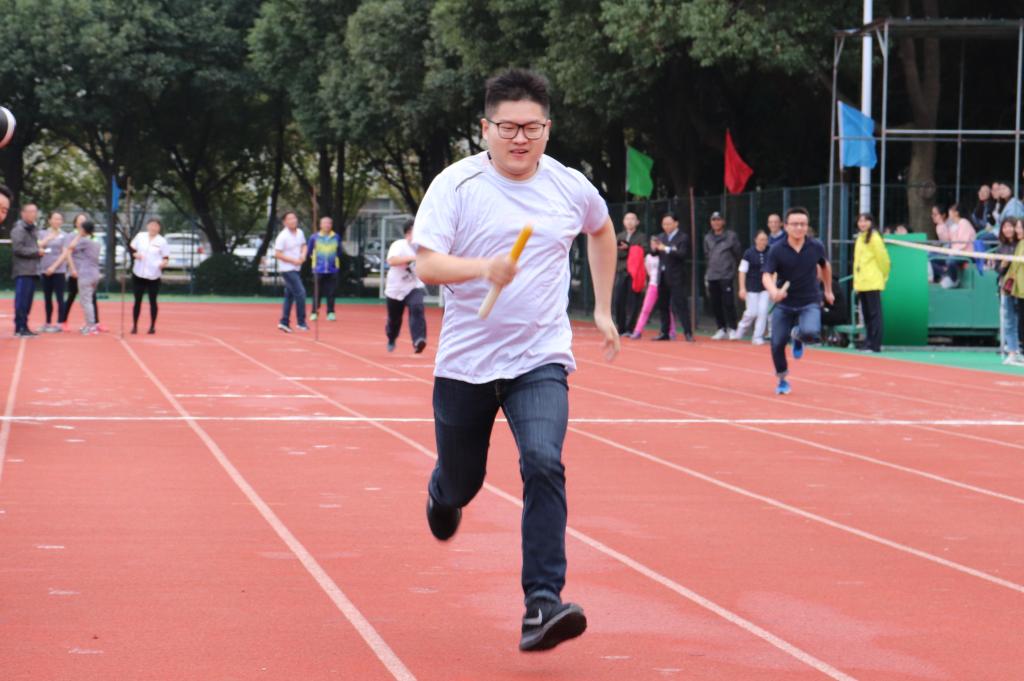 秋天的脸也变得快!第二天早晨下起了细雨,下午好在雨又停了。越秀校区的跑道上正在进行学生组最后一项比赛女子3000米,足球场上各个学院的接力赛运动员老师们早已在整装热身。今年我们外国语的接力赛队伍增添了两名青年教师——孔少杰老师和陈熙老师,大家都非常期待。唐院长比赛前的一记腾空“鹰爪功”把运动员的热情拉到了顶点。“私房tv !私房tv !”我们被分配在了最后一组。“第一!第一!”当孙彦武老师以绝对优势跑过终点的时候,大家的兴奋点达到了高潮!
