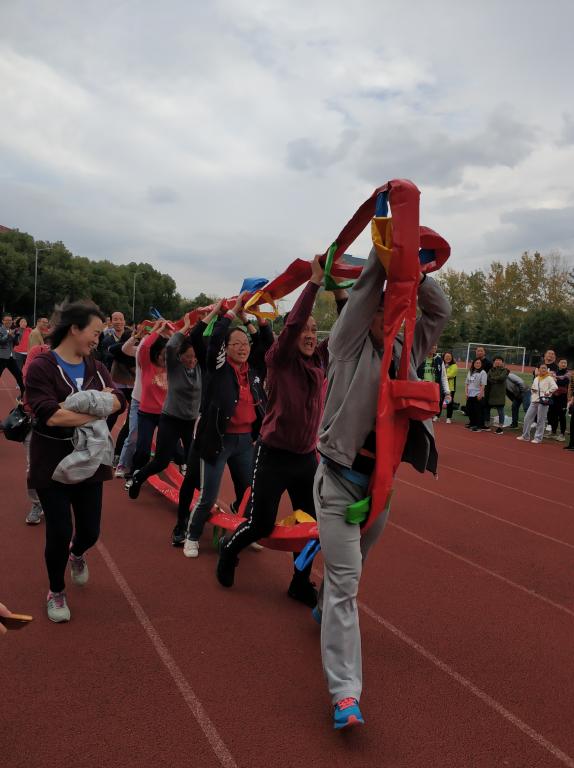 紧接着的“长风破浪”项目差点难住了10位老师!一条环状的软梯要用手脚转动起来,让大家真有点不知所措?巴普洛夫说“观察,观察,再观察。”在观察了其他院系代表队的比赛后,我们决定让刁俊春老师和周振行老师作为前后脊梁,带领8位女老师从容上阵,并取得了第六的较好成绩。充满了童趣的趣味比赛伴随着夕阳结束了,老师们依然意犹未尽,还在操场上为刚才没能充分发挥自己的最好水平而热烈讨论着。
