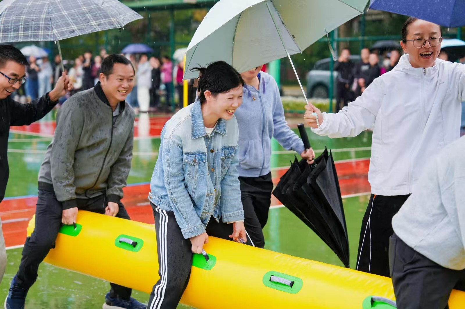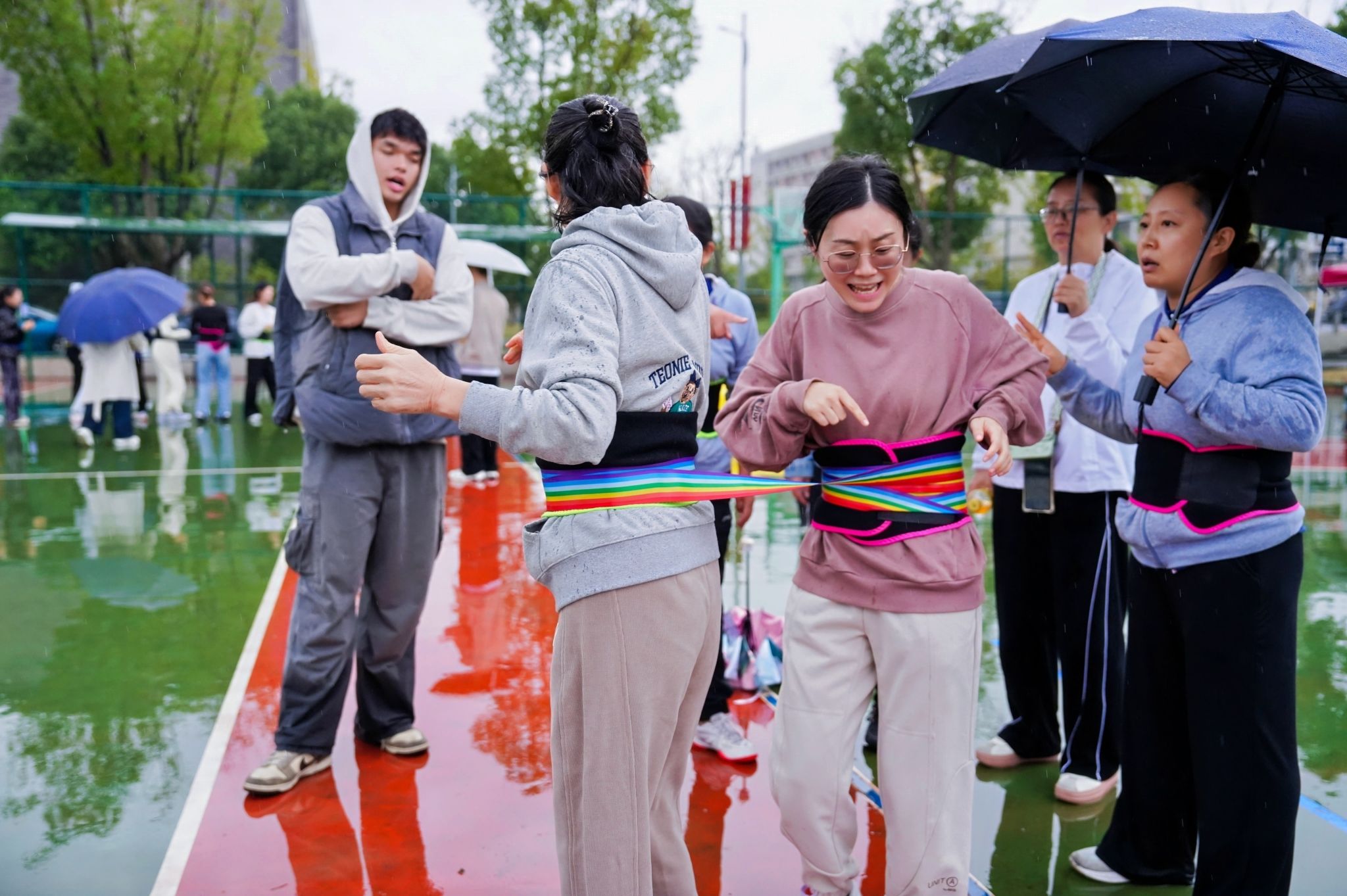 私房tv 的教师们不畏风雨,换上轻便运动装,卸下讲台前的沉稳,化身活力满满的运动达人,眼神中满是跃跃欲试的期待。本次趣味运动会设置了毛毛虫接力、巨人的脚步、八仙过海、爱的魔力转圈圈等多个兼具趣味性与协作性的项目。毛毛虫赛道上,老师们跨坐在充气“毛毛虫”道具上,齐声喊着“一二”口号,步伐整齐地同步挪动;巨人的脚步项目中,队员们套好绑腿带,在领队的统一指挥下,从最初的笨拙不协调逐渐变得流畅默契,携手冲向终点;八仙过海项目考验着大家的耐力与坚持,爱的魔力转圈圈则尽显巧思与灵活,选手们或敏捷穿梭或稳扎稳打,精彩表现引得场边喝彩声不断。
