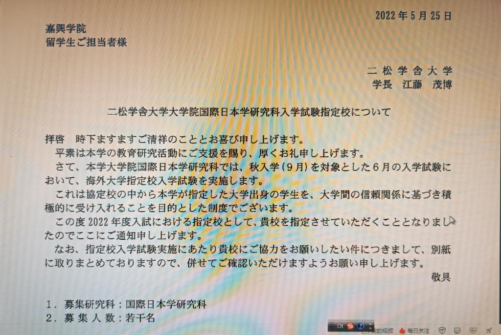 在学校国际交流处的大力支持下,我院日语专业与日本二松学舍大学建立了稳定的国际交流关系。鉴于多年来与日本二松学舍大学3+1项目顺利实施,今年,日本二松学舍大学将私房tv 确定为二松学舍大学国际日本学专业硕士研究生推荐校,希望录用私房tv 优秀日语专业毕业生赴日读研。今年2月和6月,私房tv 日语专业组织了4名毕业生参加日本二松学舍大学硕士研究生考试,考试时间、内容和录用通知与日本国内同步进行。6月17日,私房tv 日语专业4名毕业生均以优异的成绩通过了日本二松学舍大学硕士考试,被日本二松学舍大学录取为国际日本学专业的硕士研究生,录取率为100%。