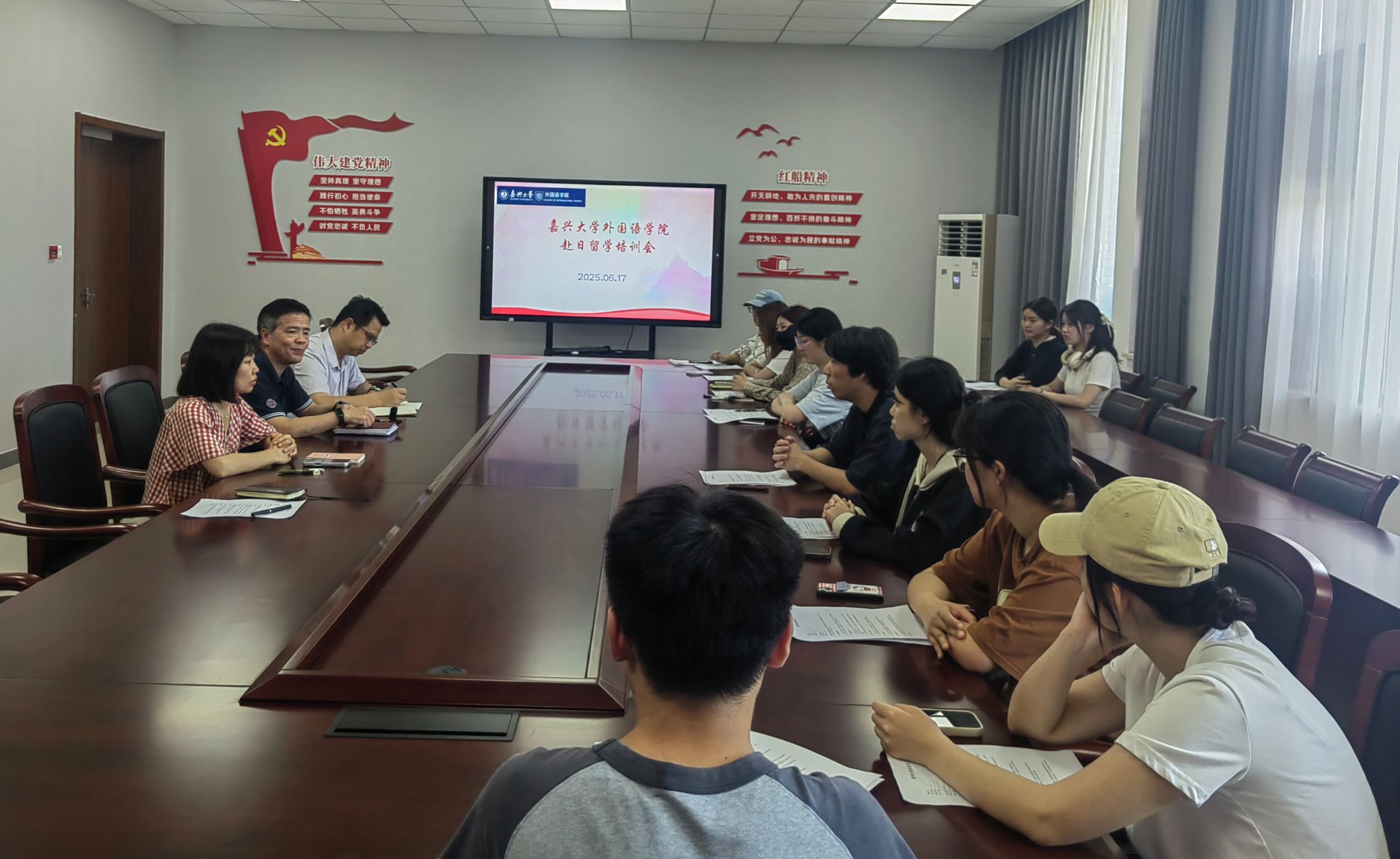 6月17日中午,私房tv 在兴德楼南楼516会议室为2025年秋季即将赴日本留学的11名学生举办行前教育会,会议围绕爱国情怀、人身安全、学业提升和外事纪律等方面展开。学院院长唐艳芳、党委副书记张啸峰、日语系主任王雪分别从不同方面对学生做了行前教育辅导。会议由日语系副主任董旭阳主持。