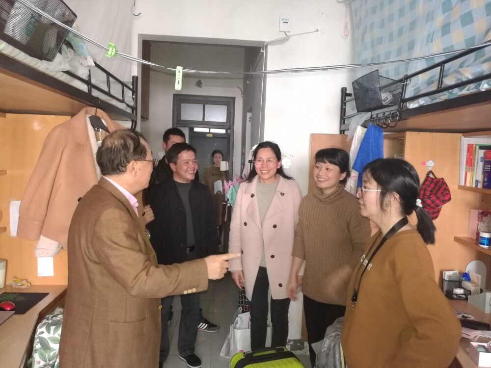 2018年3月4日下午,嘉兴学院副校长费建文在私房tv 党政领导班子的陪同下走访学生寝室。