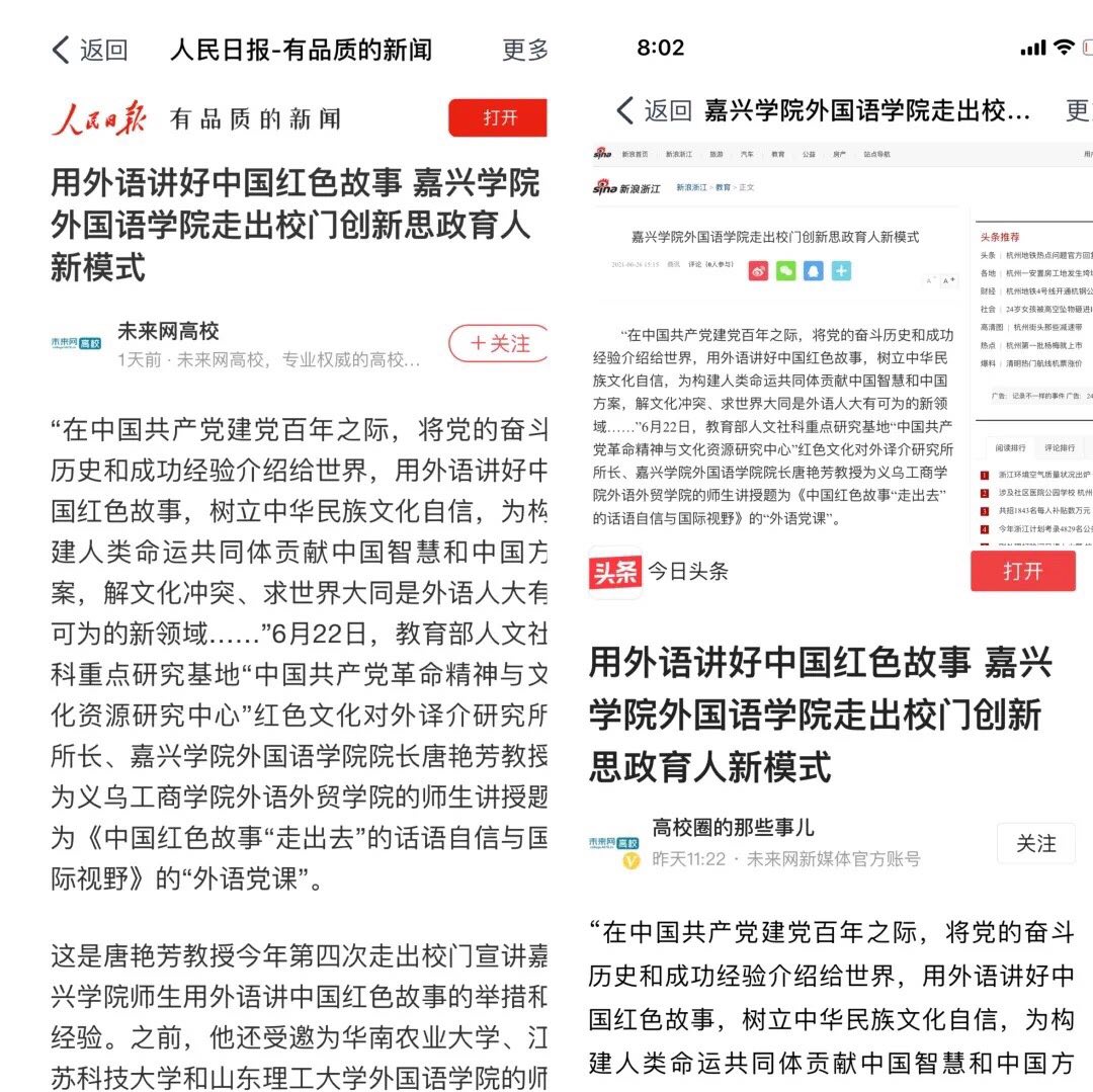 近日,我院唐艳芳院长从事的红色文化资源译介工作被《人民日报》新媒体客户端、新浪网、今日头条、读嘉、嘉兴电视台禾点点等多家媒体报道,红色文化资源译介工作的影响力和传播力进一步提升。