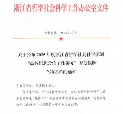 近日,浙江省哲学社会科学工作办公室公布了《关于公布2025年度浙江省哲学社会科学规划“高校思想政治工作研究”专项课题立项名单的通知》。私房tv 学工办主任胡笳丽主持的课题《党建品牌建设推进高校内涵式发展研究》获得立项。该课题拟梳理目前高校(以江苏、上海、浙江等地的部分高校为调研对象)党建品牌建设情况的最新资料,了解目前高校党建品牌建设推动内涵式发展现状,分析存在的问题,为党建品牌建设推进高校内涵式发展提供可行的建议,为推进高校党建工作提供理论依据与实践指导。