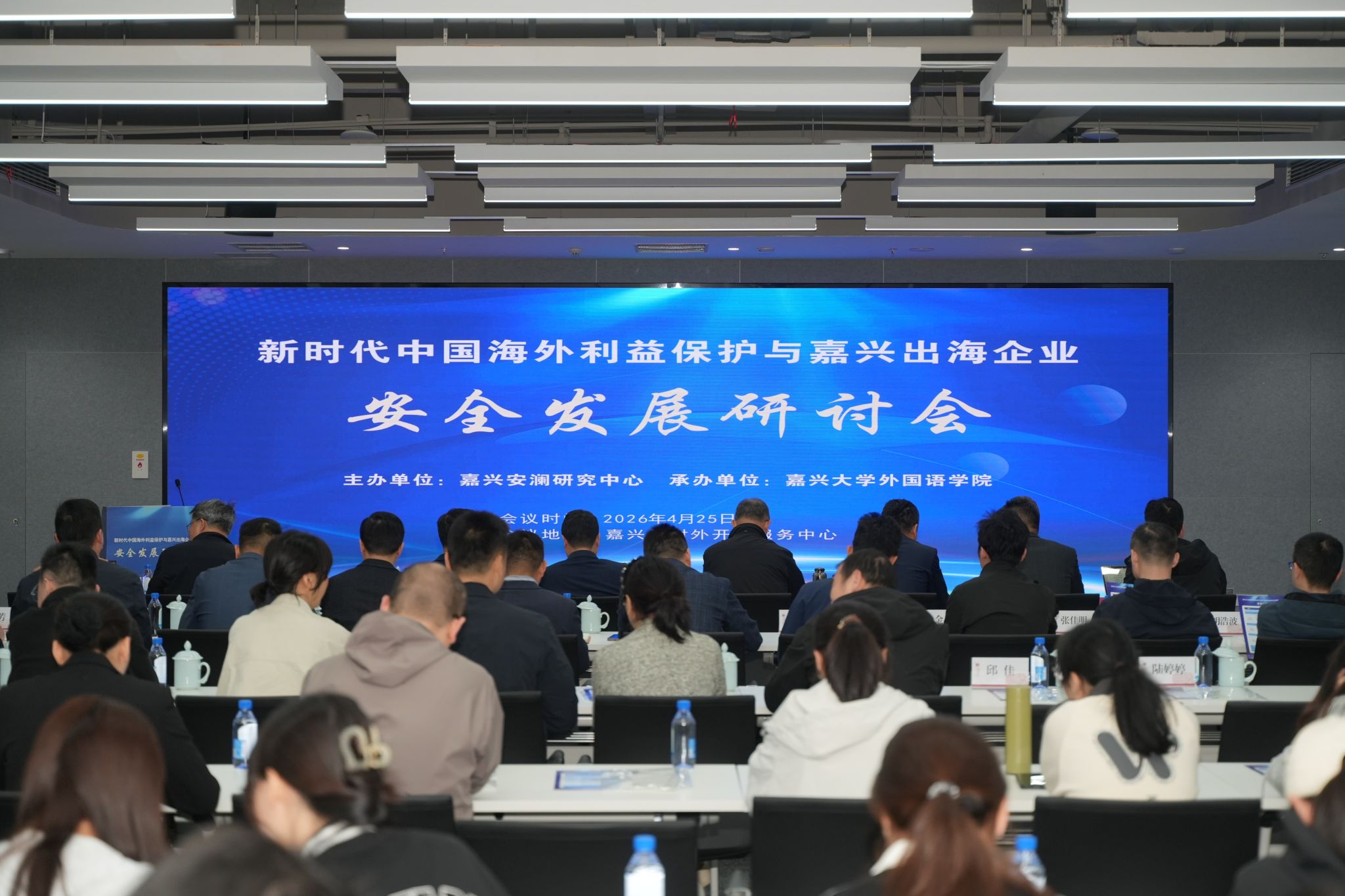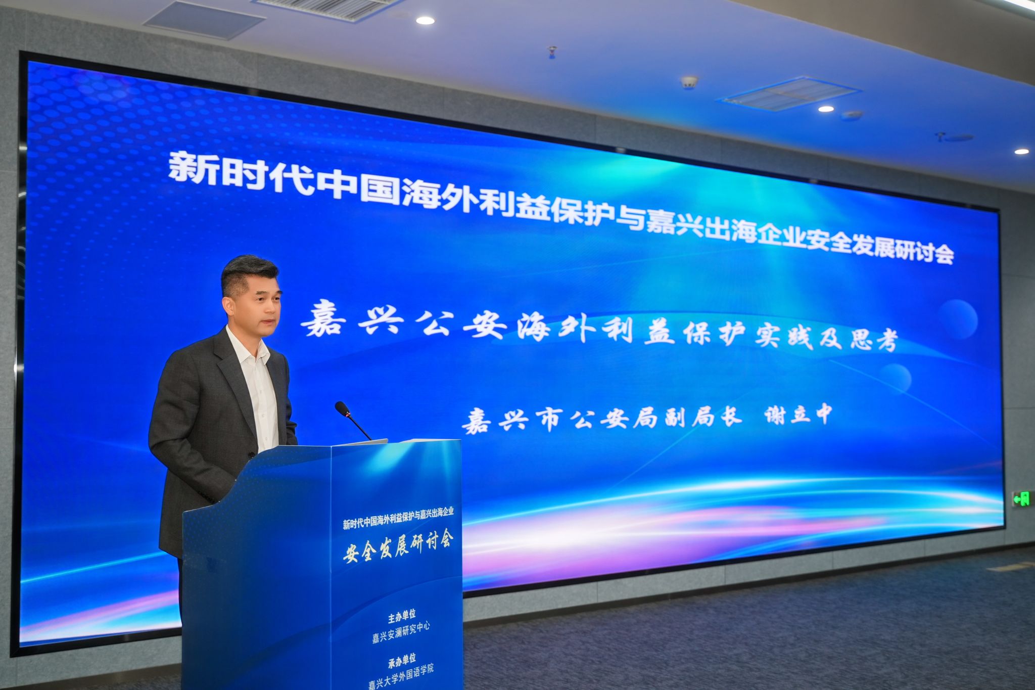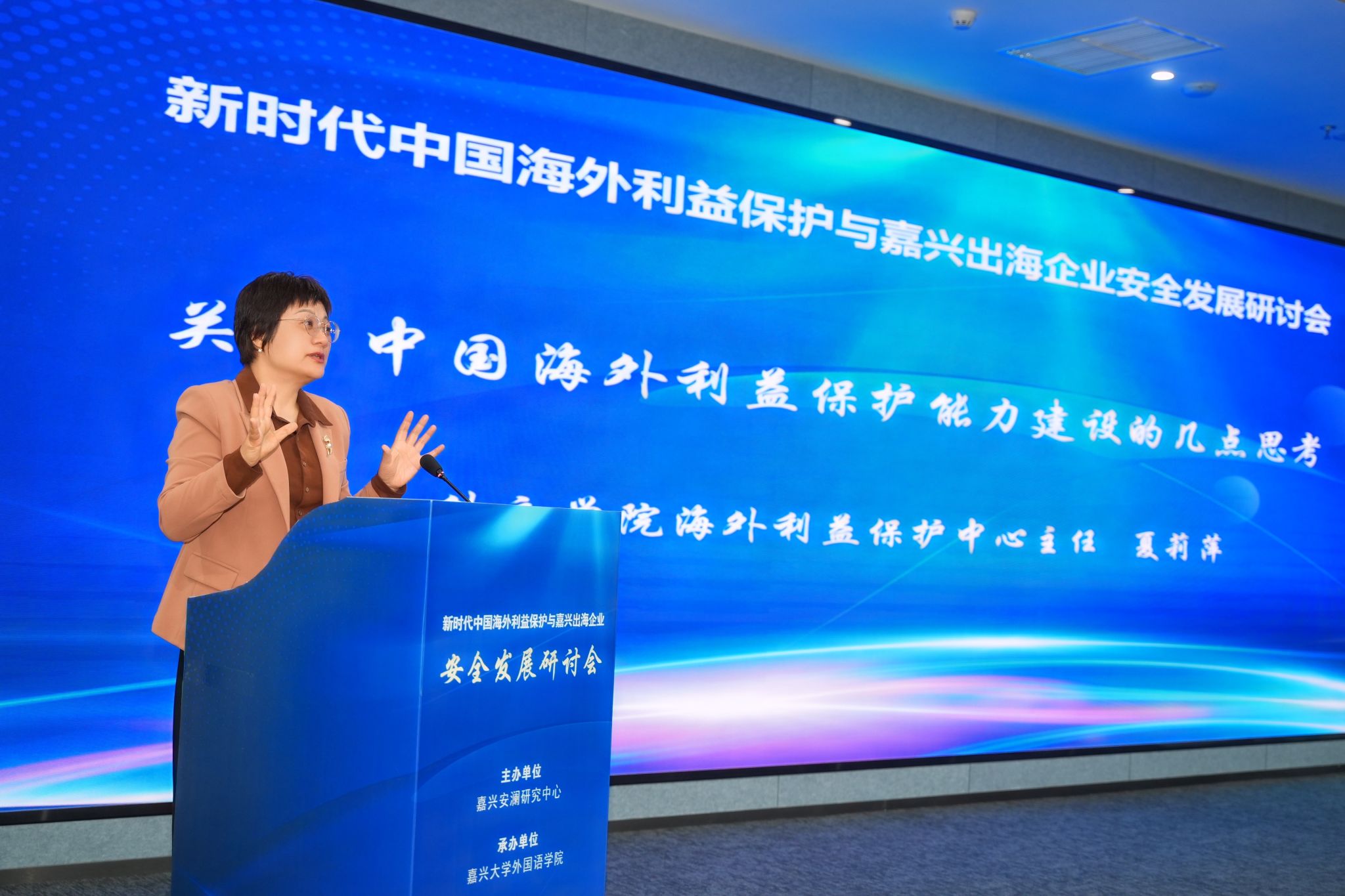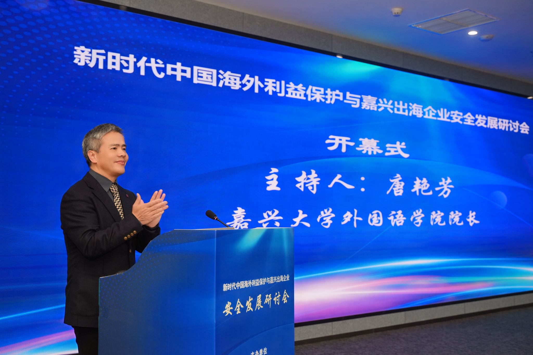 4月25日,新时代中国海外利益保护与嘉兴出海企业安全发展研讨会在嘉兴召开。私房tv 党委副书记於建明,嘉兴市人民政府外事办公室主任王建峰、中共嘉兴市委办公室副主任鲁佳、嘉兴市公安局副局长谢立中出席会议。私房tv 院长、嘉兴安澜研究中心主任唐艳芳主持开幕式。